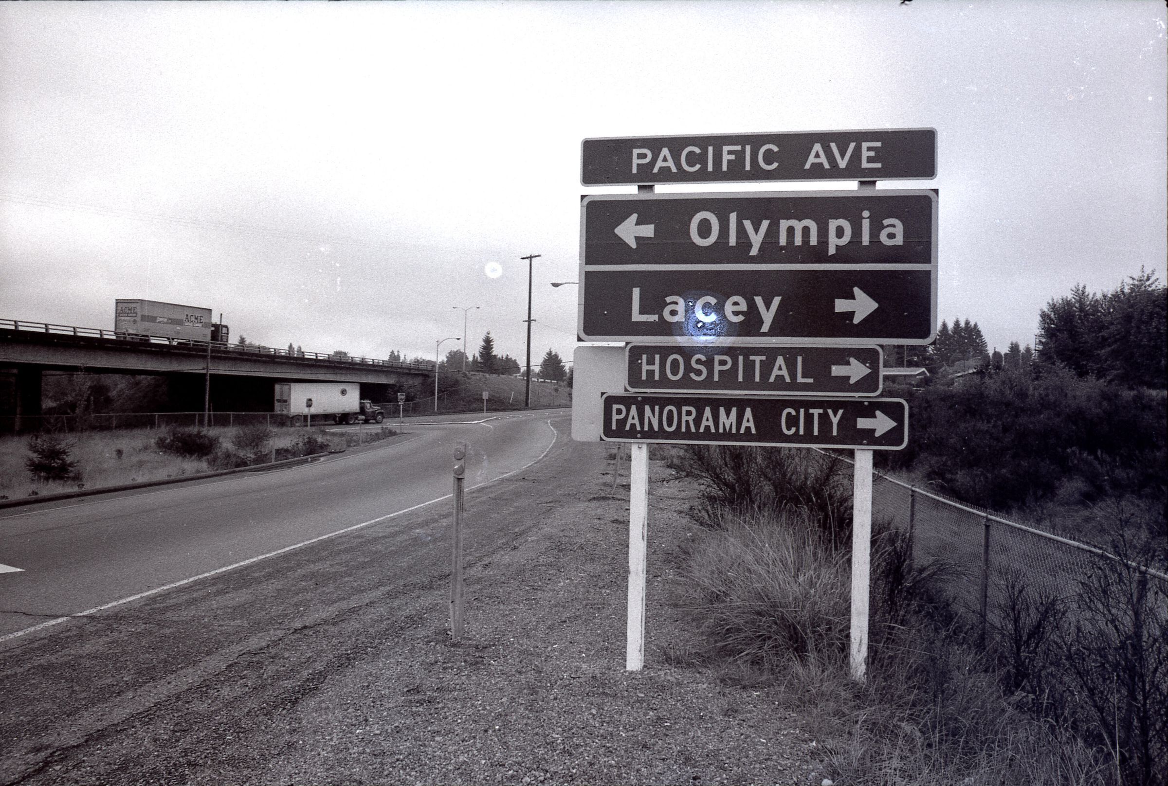 The images in the third group show a football game (possibly high school) (20c-24c). Also in this series (25c) is a road sign. The sign reads, from top to bottom, "PACIFIC AVE," "OLYMPIA," "LACEY," "HOSPITAL," and "PANORAMA CITY."