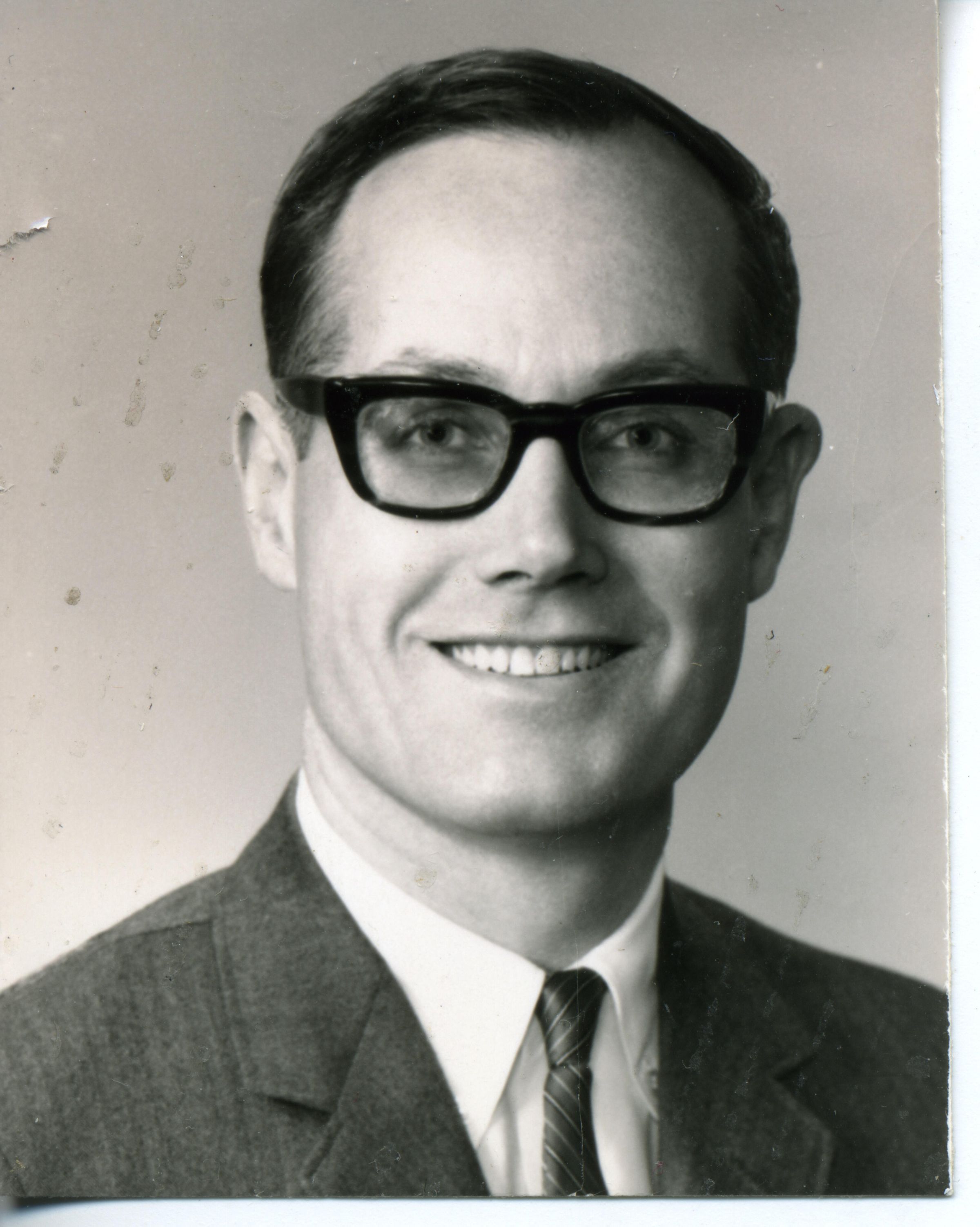 Black and white photo of Slade Gorton, former Attorney General of Washington. The image is of a smiling man wearing glasses and a suit and tie. The print is glossy with a wrinkle. There is no border. On the back is written in pencil "Slade Gordon [sic]". The back has some browning indicating age.