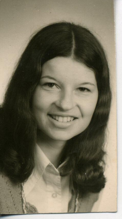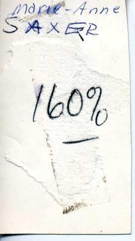 Black and white photo of Marie Anne Saxer. There is no border. The image is a smiling young woman with hair parted in the middle and hanging below her shoulders. There is a white blouse under a darker jacket. On the back in blue ink are the words "Marie-Anne Saxer" and the number "160%". The surface of the back is torn as if it had been glued to something.