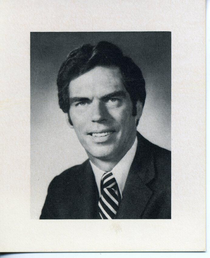 Black and white head and shoulder photo of Ludlow Kramer. He is half smiling with dark hair and a clean-shaven face. He is wearing a suit, white shirt, and tie. There is a white border on all sides of the photo. On the back of the photo is "Kramer".