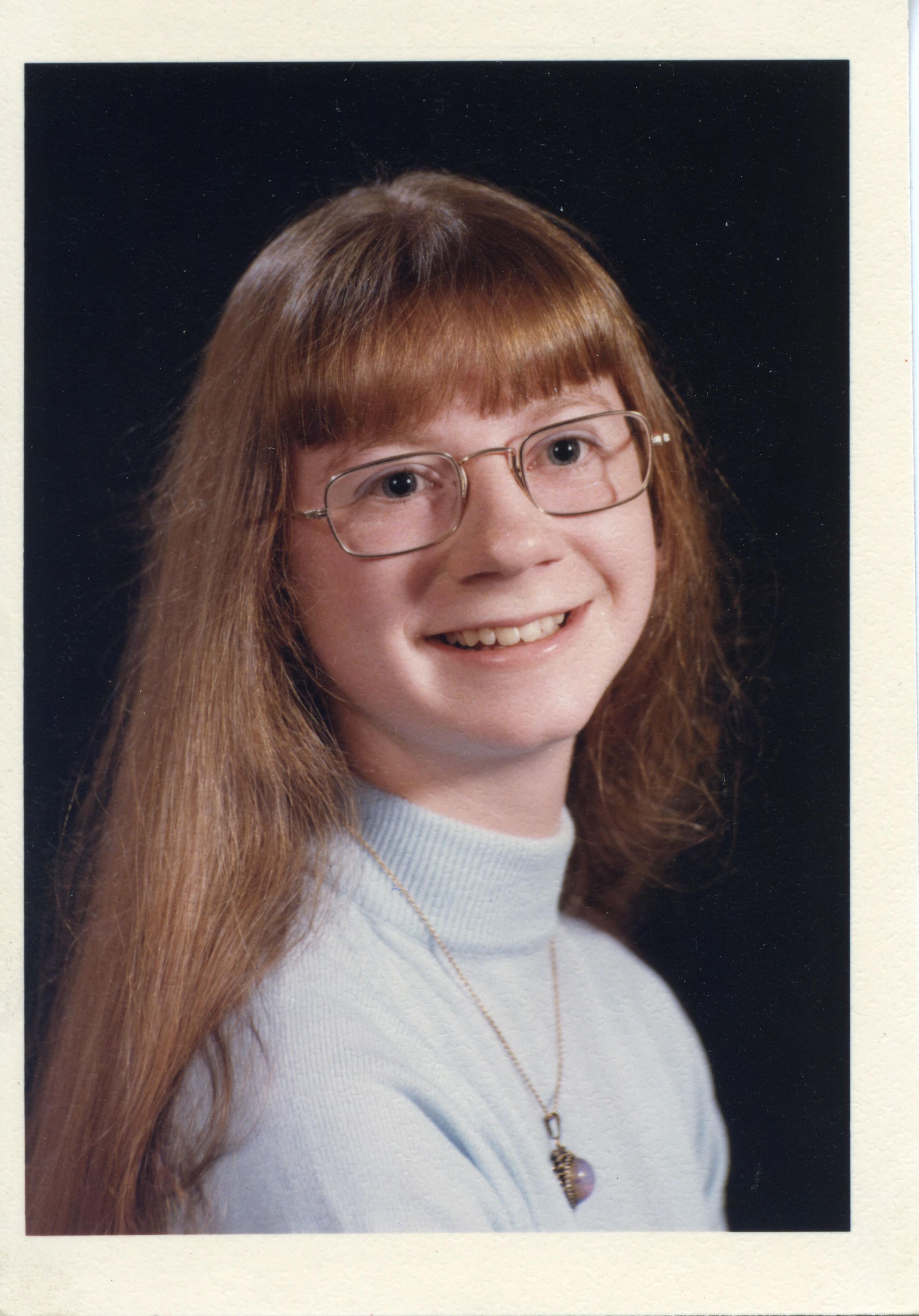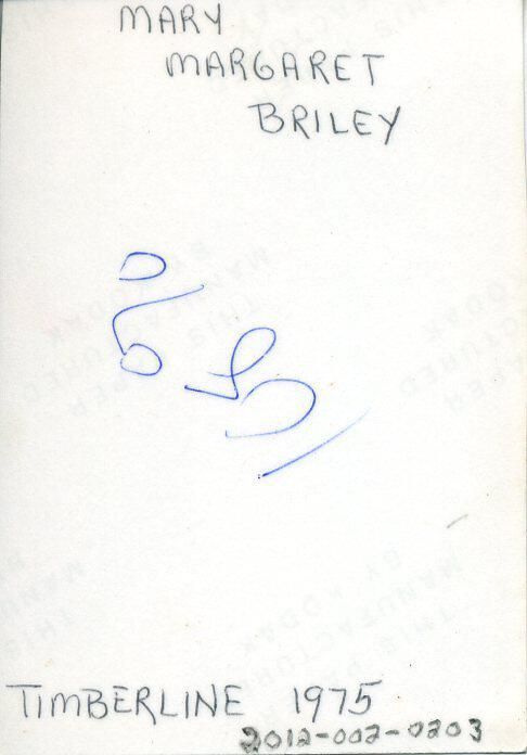 Color photo of a smiling girl. She has very long brown hair and is wearing glasses. She has on a gray turtle-neck sweater and a necklace with a locket. There is a white border on all sides. On the back of the photo is "Mary Margaret Briley", "Timberline 1975", and "108%".