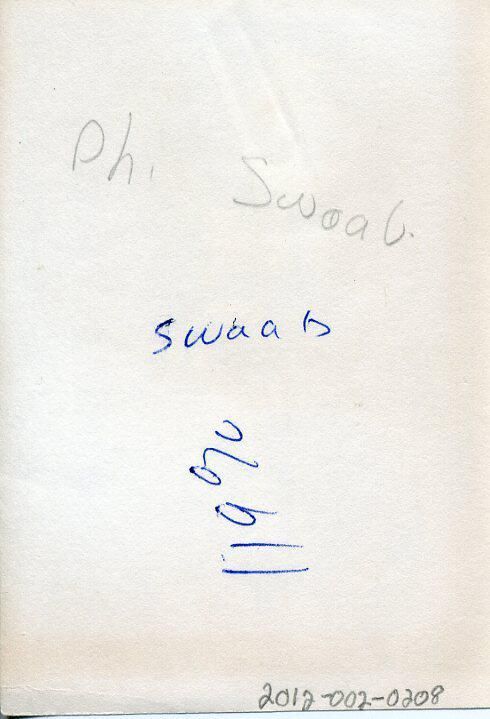 Black and white photo of a gentleman with dark hair above a receding hair line. The hair is long on the sides and partially covers his ears. The man has a mustache and is wearing a light colored suit, white shirt, and tie. There is a white border on all sides of the image. On the back is printed in ink "Swaab" and in pencil "Phi Swaab". Also in ink is "119%".