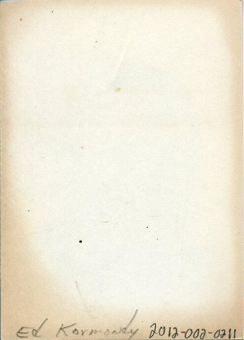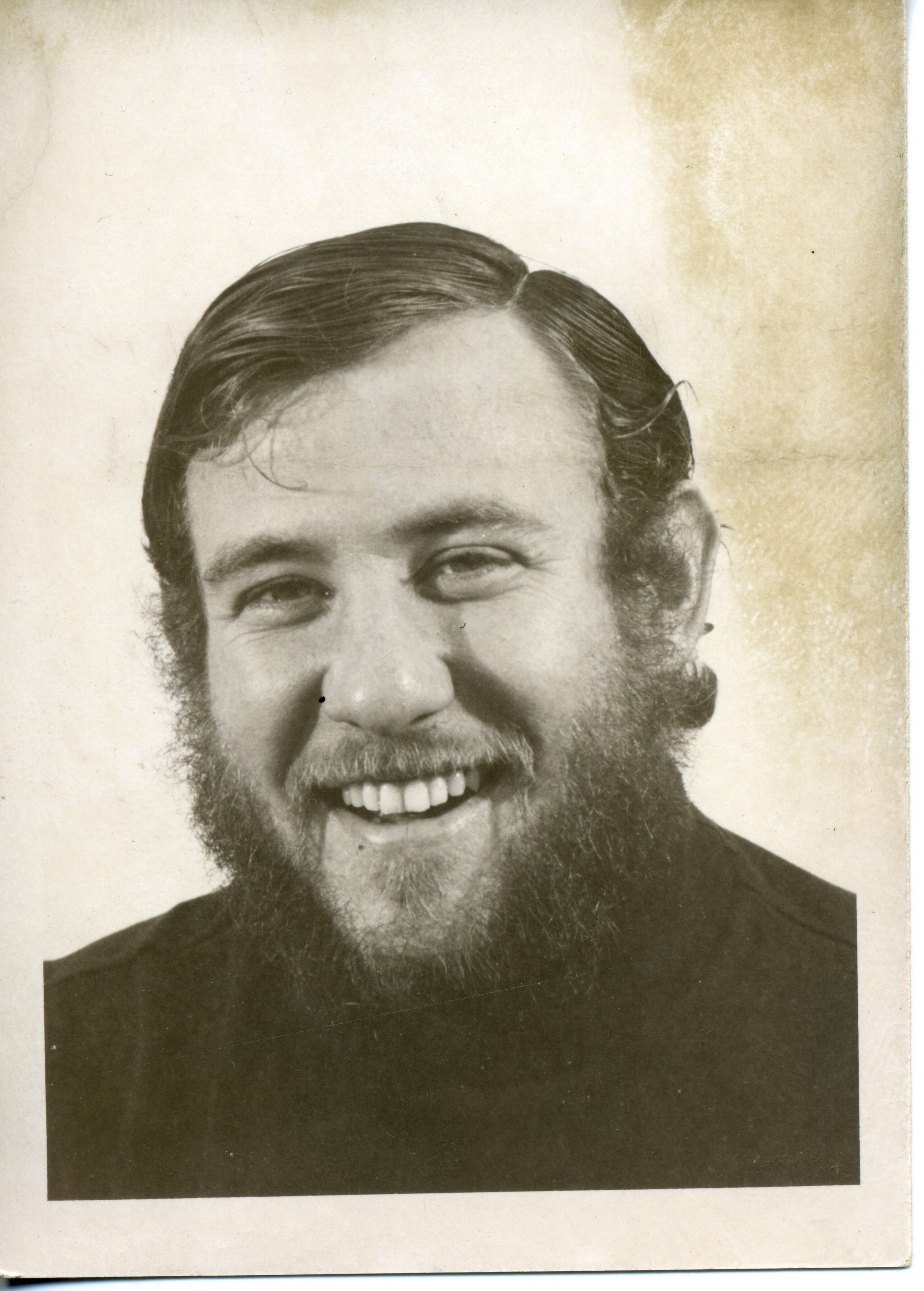 Black and white photo of a smiling man. He has medium length dark hair and a dark beard and mustache. He is wearing what appears to be a dark turtle neck sweater. There is a white border on all sides of the image. On the back in pencil is "Ed Karmody".Made/Created