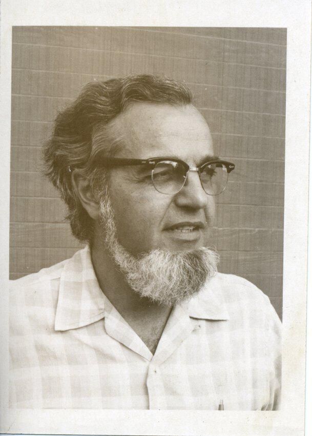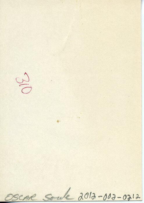 Black and white photo of a man. He is wearing glasses and has short curly dark hair and a dark beard and sideburns that is mostly gray. He has on a light colored open shirt with a large check pattern. In the background is a tile wall There is a white border on all sides of the image. On the back is written in pencil "Oscar Soule" and in red ink "310".Made/Created
