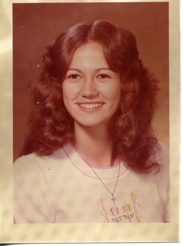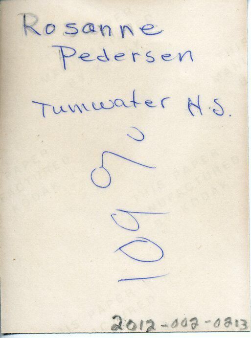 Color photo of a smiling girl. She has shoulder length reddish hair and wears a necklace with a cross. She has on a crew-neck top with flower images below the neck. There is a white border on all sides. The photo has a dark pattern over the entire area including the border. On the back is written in ink "Rosanne Pedersen, Tumwater H. S." and "109%".