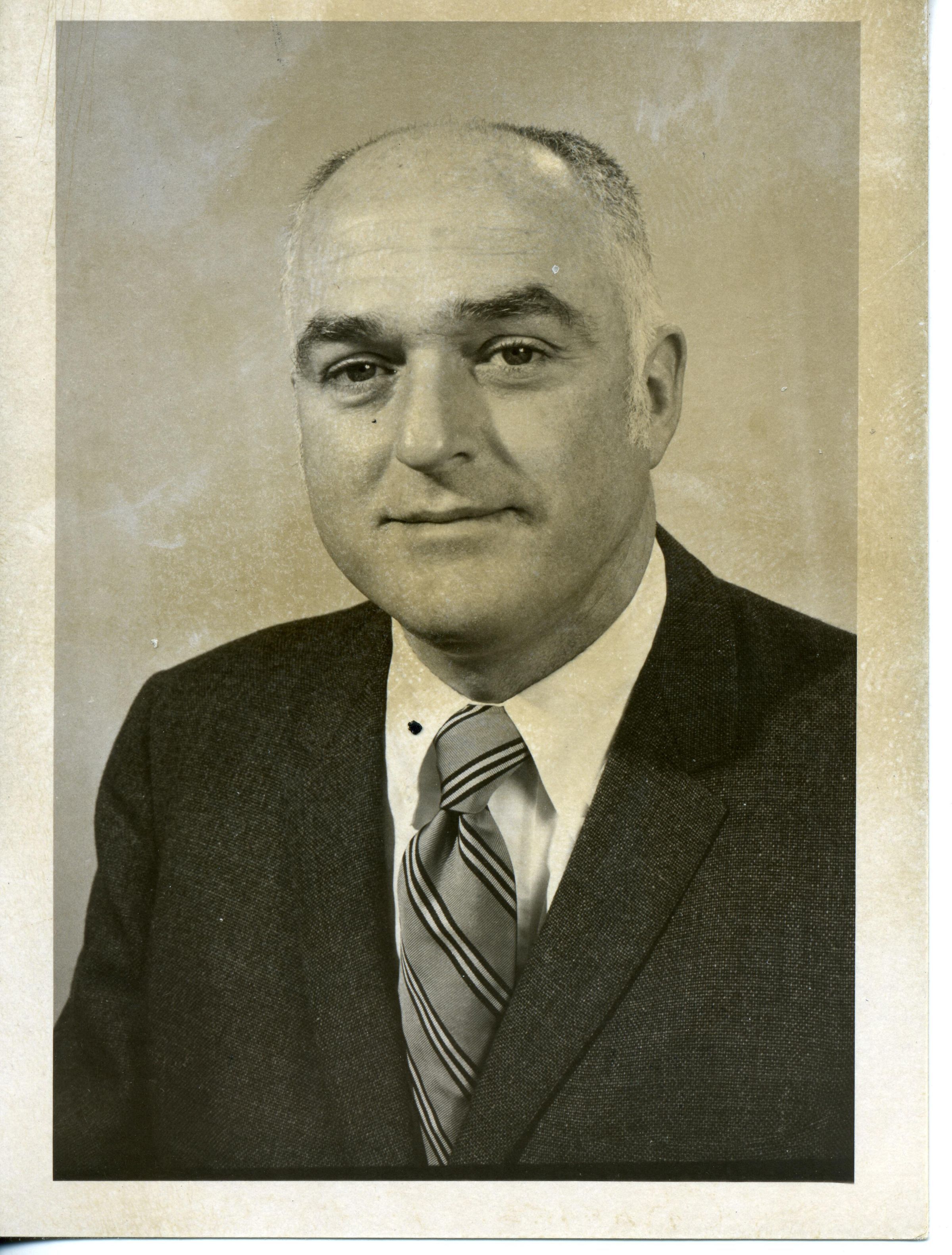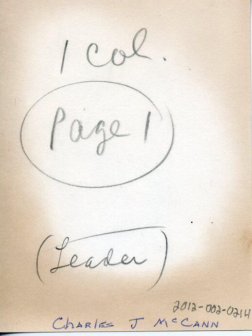 Black and white photo of a man wearing a suit, white shirt, and striped tie. The man has a slight smile, and is mostly bald. There is a white border on all sides. On the back is, in pencil,"1 Col", "Page 1" in a circle, and "Leader" in a circle. In ink is "Charles J McCann". The photo, particularly on the back, is fairly discolored..