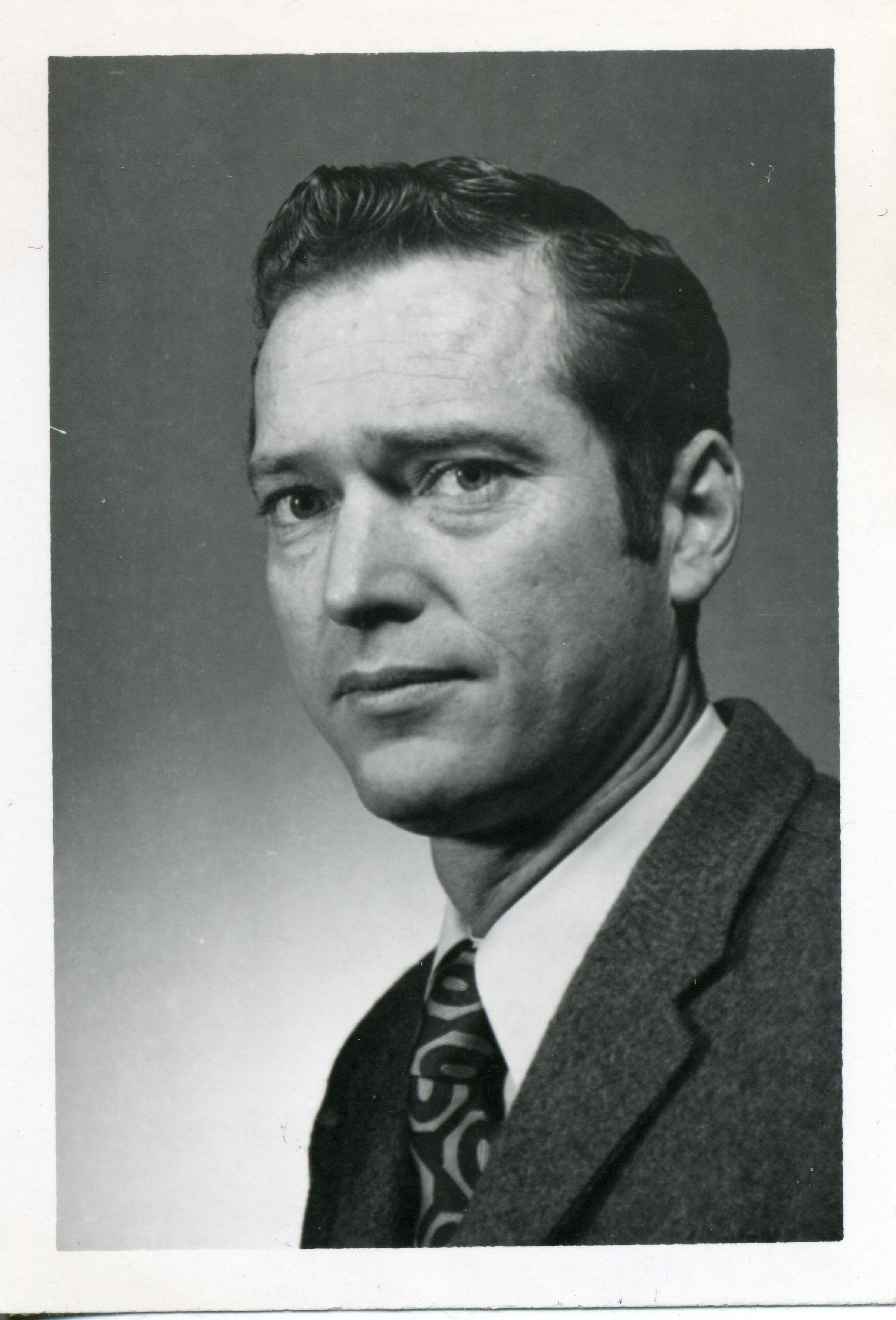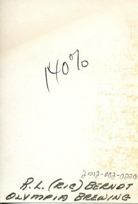 Black and white photo of a man with medium length dark hair. He is wearing a dark jacket, a white shirt, and a black and white patterned tie. there is a white border on all sides. On the back in blue ink is "140%" and in black ink is printed "R. L. (Ric) Berndt, Olympia Brewing". There is some discoloring on the back.
