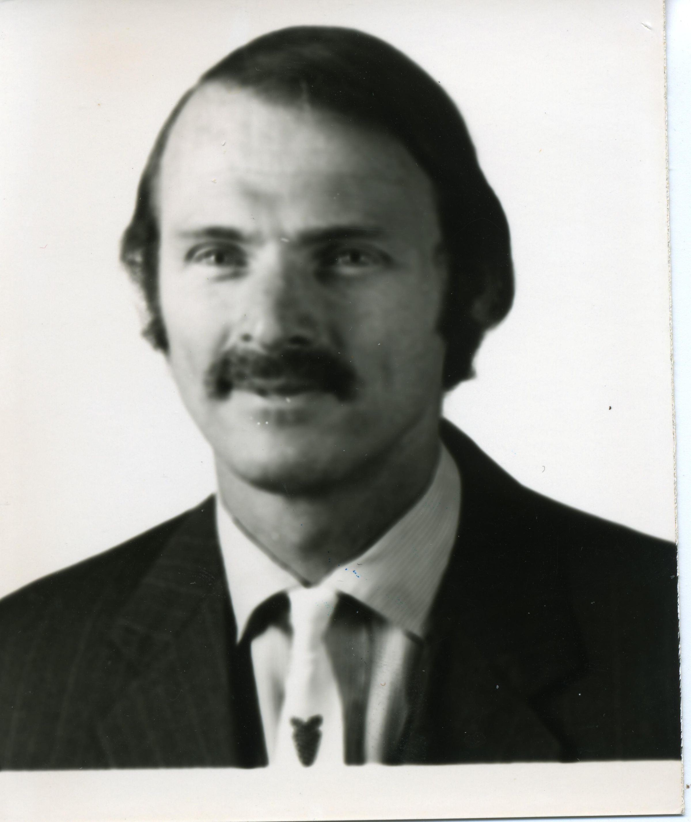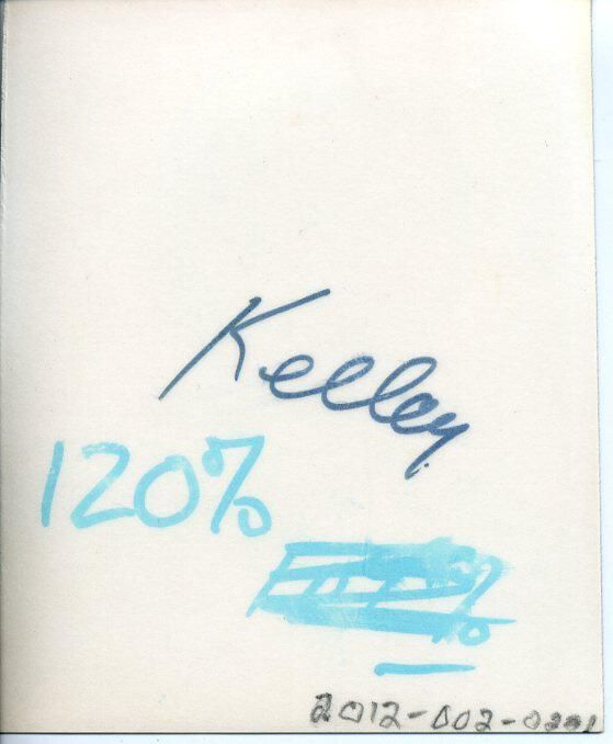 Black and white photo of a man with fairly long dark hair and a short mustache. He is wearing a dark suit coat, a white shirt, and a tie with a pattern. There is a border at the bottom only. On the back is written, in ink, "Keeley" [see Notes and Legal] and in blue felt pen "120%" Something else had been written with the same felt pen and crossed out.