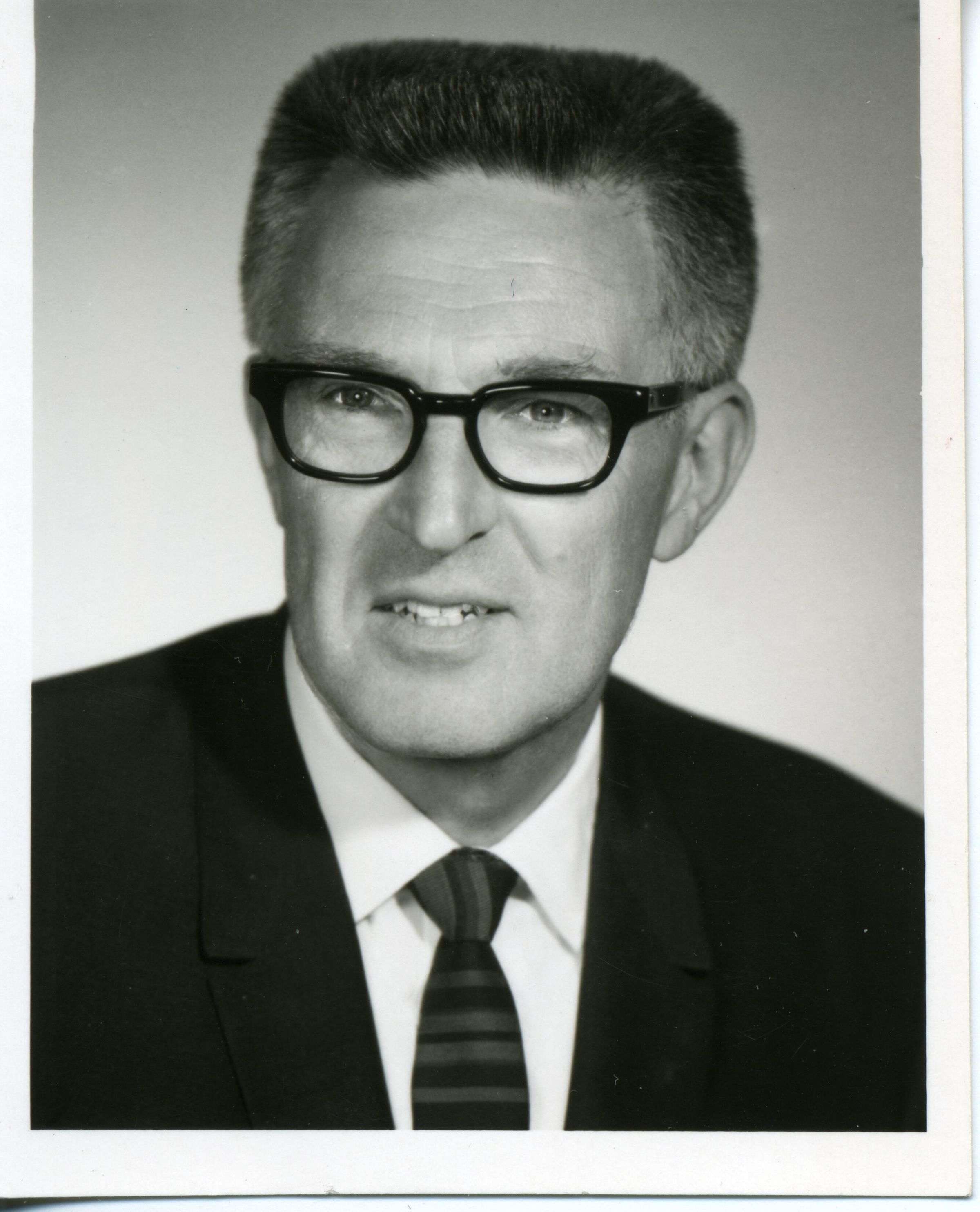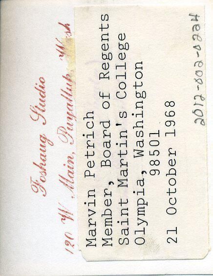 Black and white photo of Marvin Petrich, a member of the Board of Regents of Saint Martin's College. He has short dark hair and is wearing glasses, a dark suit coat, a white shirt, and a tie. There is a white border on all sides. On the back in red ink is "Foshaug Studio, 120 W. Main, Puyallup, Wash", and on an attached piece of paper is typed "Marvin Petrich, Member, Board of Regents, Saint Martin's College, Olympia, Washington 98501, 21 October 1968".Made/Created