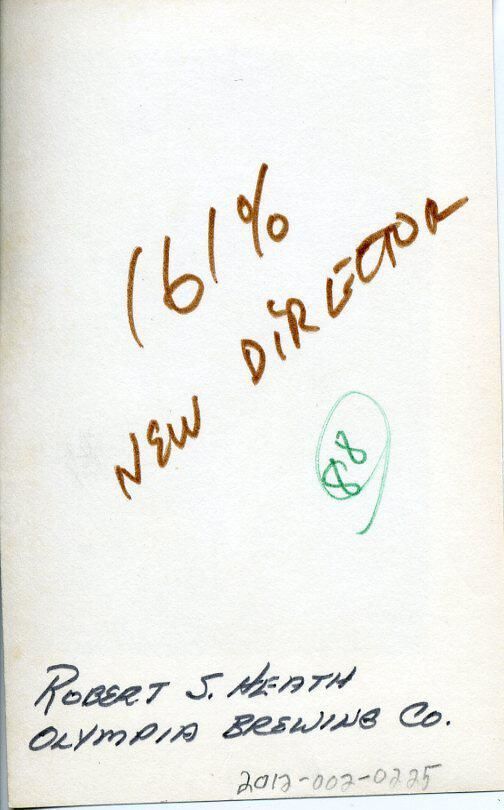Black and white glossy photo of Robert S. Heath. The man has short dark hair and is wearing glasses. He has on a light colored suit jacket, a white shirt with a pattern, and a dark tie. There is a white border on all sides with a larger border at the bottom, and the image is skewed inside the border. On the back in red ink is "161%" and "New Director". In green ink is "88" in a circle. In black ink is "Robert S. Heath, Olympia Brewing Co.".