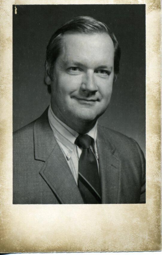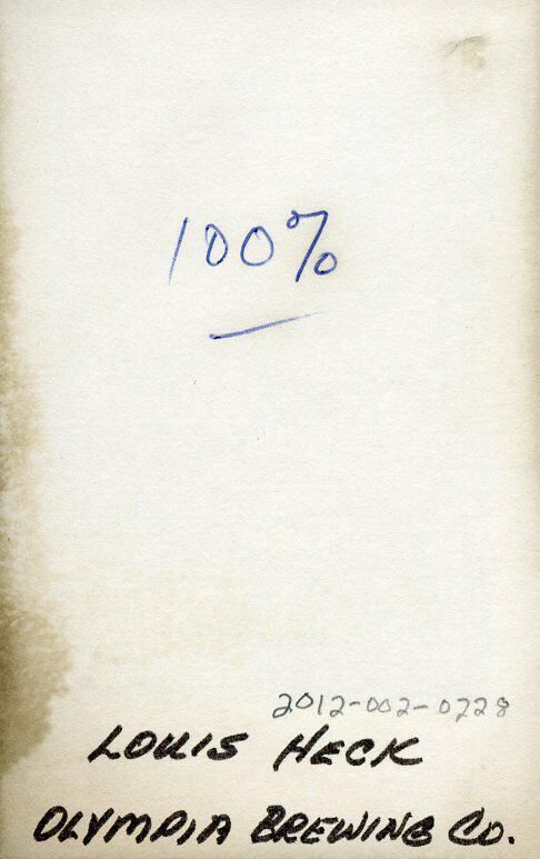 Black and white photo of a smiling Louis Heck. He has short dark hair and is wearing a dark suit, a white striped shirt, and a dark tie with a pattern. There is a border on all sides with the border being larger at the bottom. The border is darkened in places with age. On the back in ink is "100%" and in black felt pen "Louis Heck, Olympia Brewing Co.".