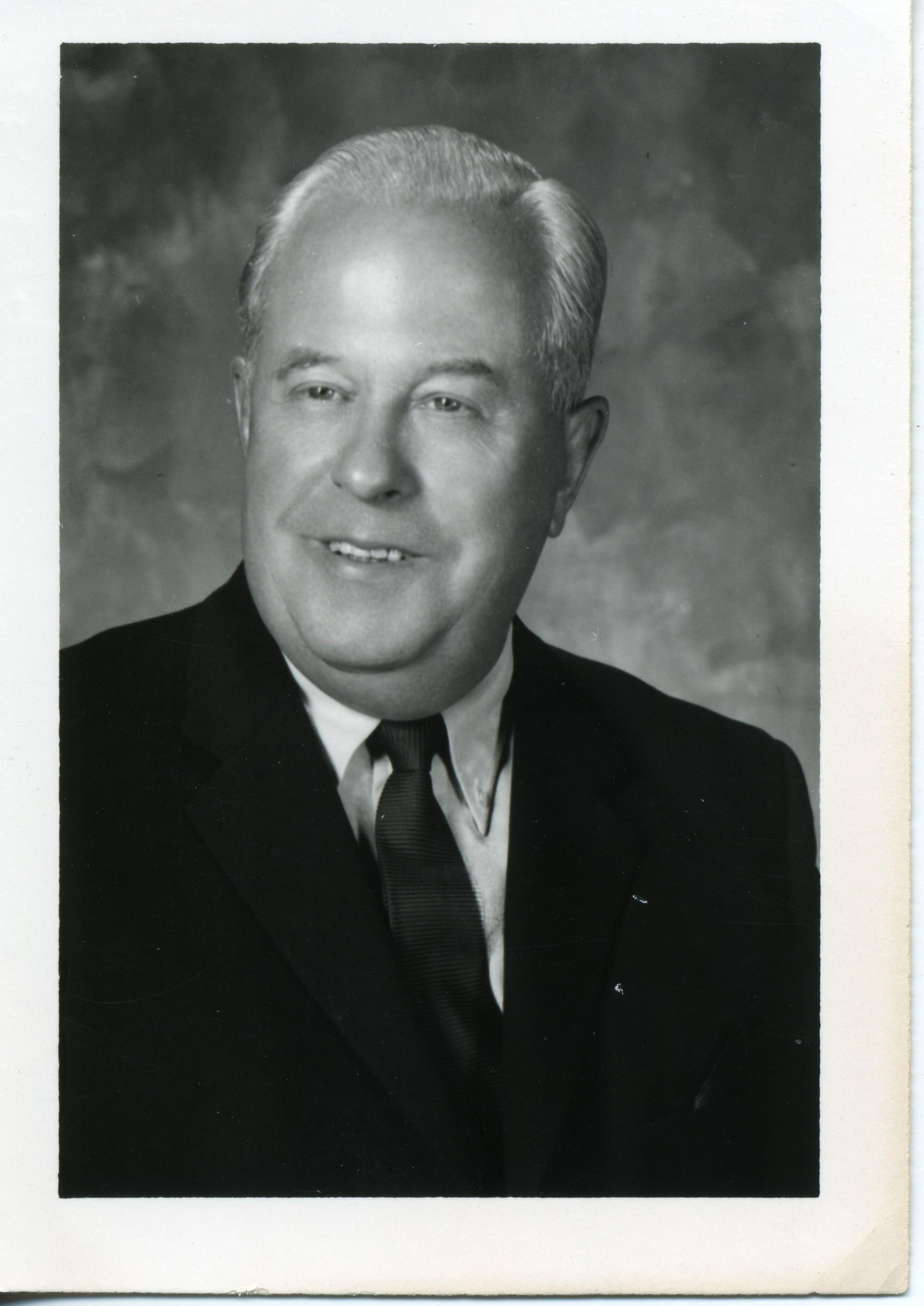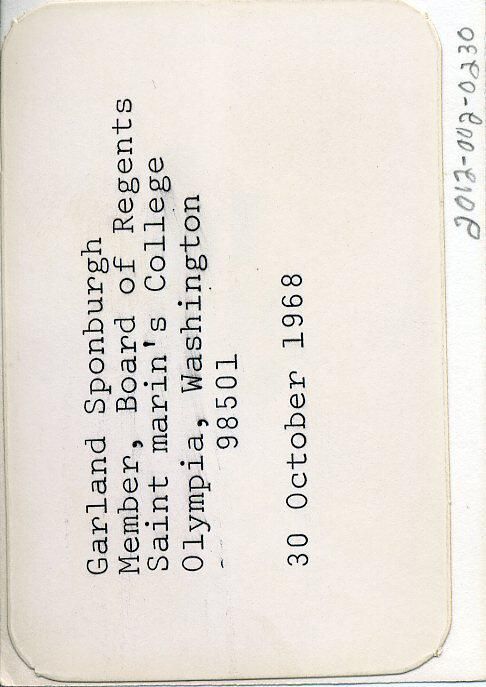 Black and white photo of Garland Sponburgh. He is smiling slightly and has short gray hair. He is wearing a dark suit, a white shirt, and a dark tie. There is a white border on all sides. A paper has been pasted on the back of the photo that has the following typed on it: "Garland Sponburgh, Member, Board of Regents, Saint marin's [sic] College, Olympia, Washington 98501, 30 October 1968"Made/Created