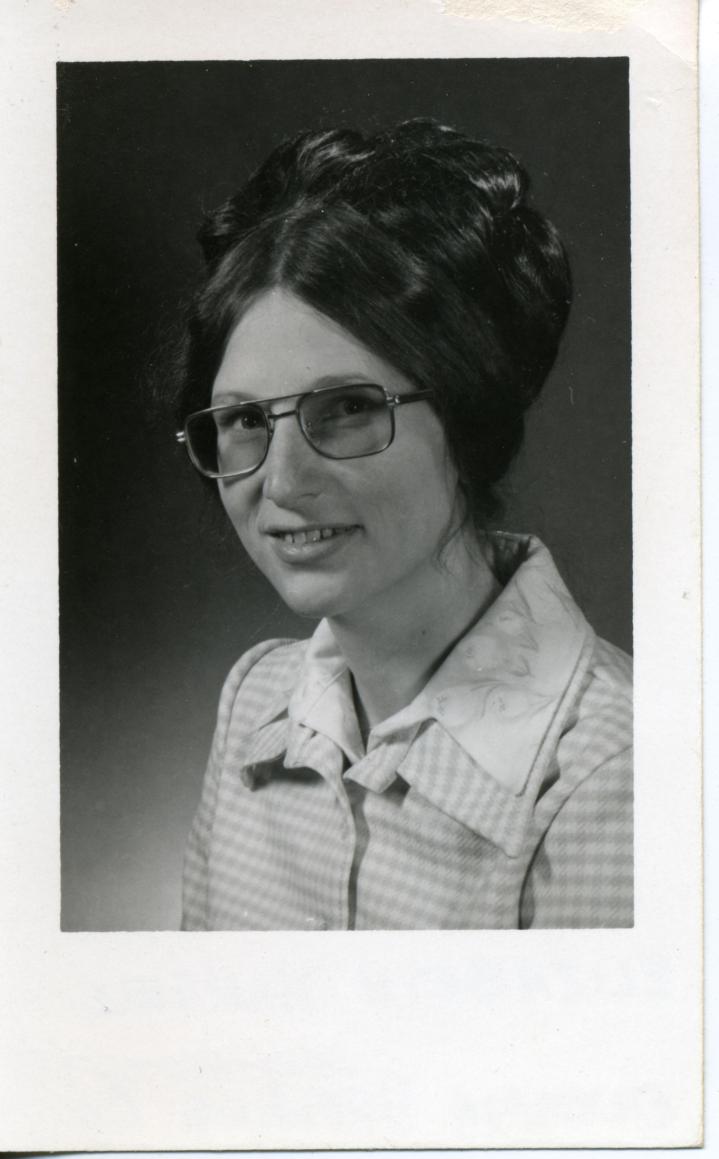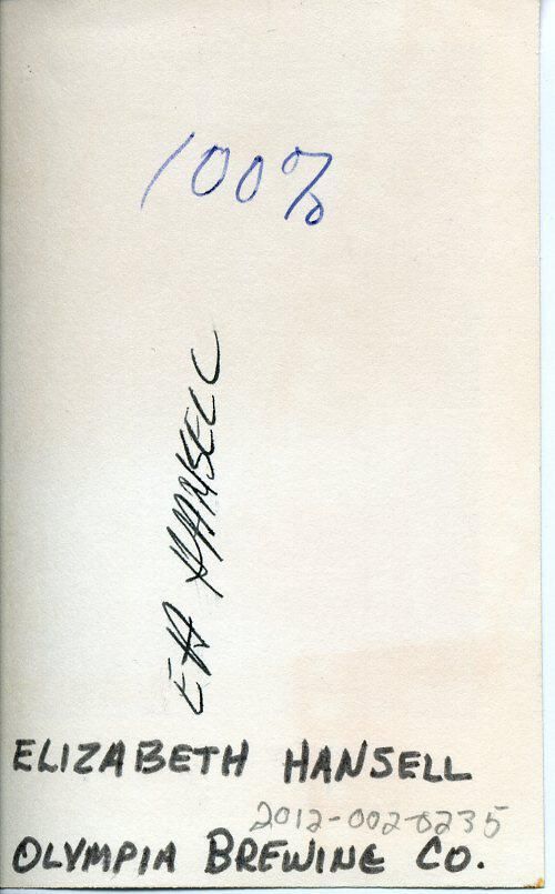 Black and white photo of Elizabeth Hansell. She is wearing glasses and has a large amount of dark hair piled high on her head. She is wearing a light colored patterned jacket over a light colored blouse with patterns on the collar. There is a white border on all sides with the bottom border being larger. On the back in ink is "100%", in a different hand "Ela Hansell", and in another style "Elizabeth Hansell Olympia Brewing Co.".