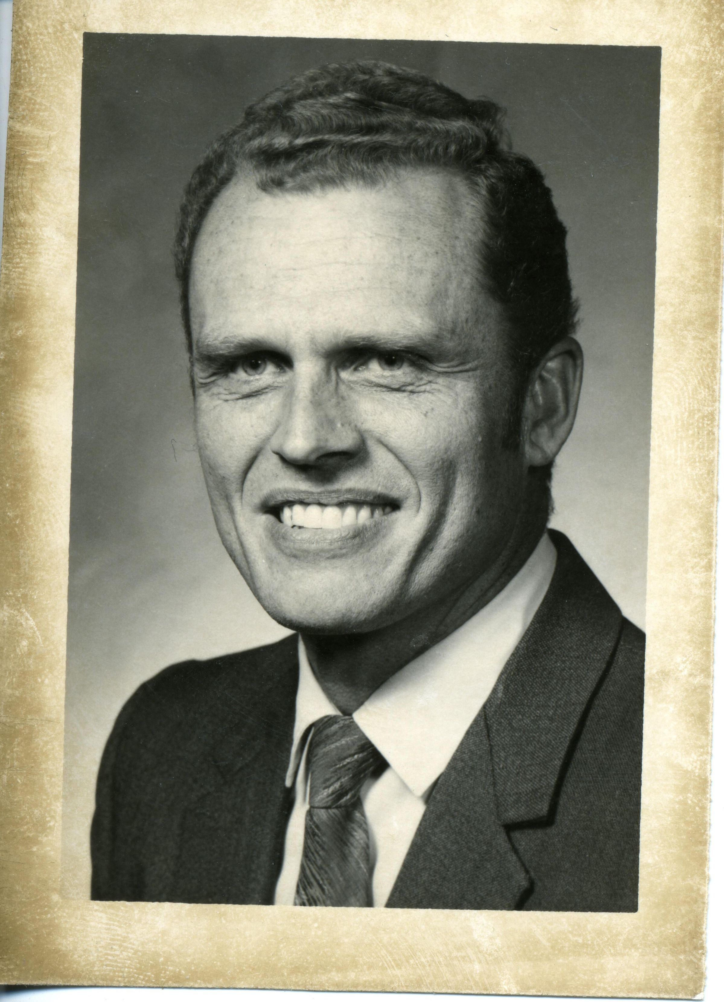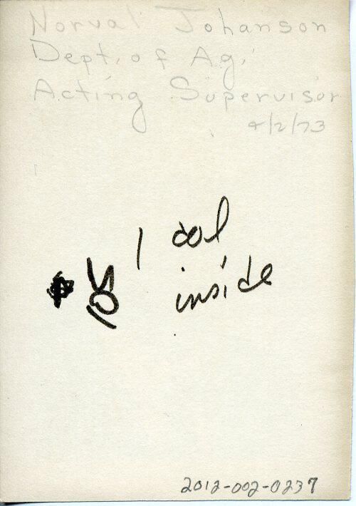 Black and white photo of a smiling Norval Johanson. He has short dark curly hair and is wearing a dark suit with a white shirt and a tie with stripes. There is a white border on all sides. On the back in very light pencil is "Norval Johanson, Dept. of Ag., Acting Supervisor, 9/2/73", and in ink, "105" and "1 col inside". There is considerable browning from age.