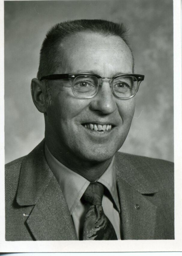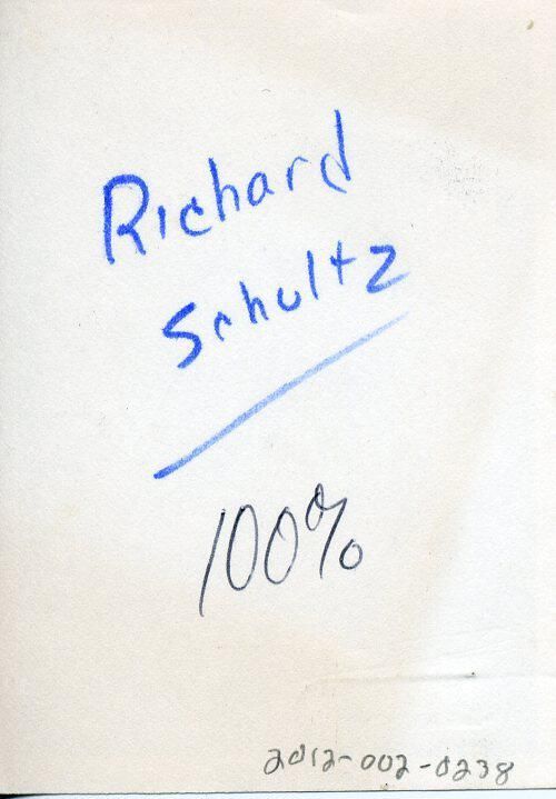 Black and white photo of a smiling Richard Schultz. He has close-cropped dark hair and is wearing glasses. He has on a dark suit, a light colored shirt, and a dark tie. The background is a mottled color. There is a white border on all sides. On the back in blue felt pen is "Richard Schultz" and in ink is "100%".