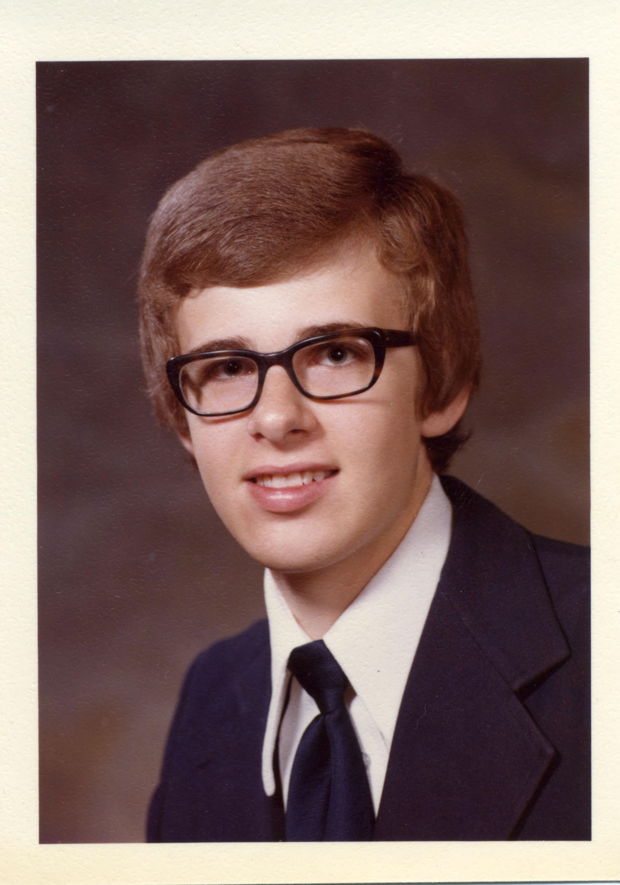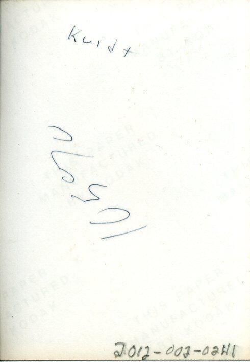 Color photo of a man named Kuidt. He has fairly long brown hair and is wearing glasses. He is wearing a suit, a white shirt, and a dark tie. There is a white border on all sides. On the back in ink is "Kuidt" and "105%".