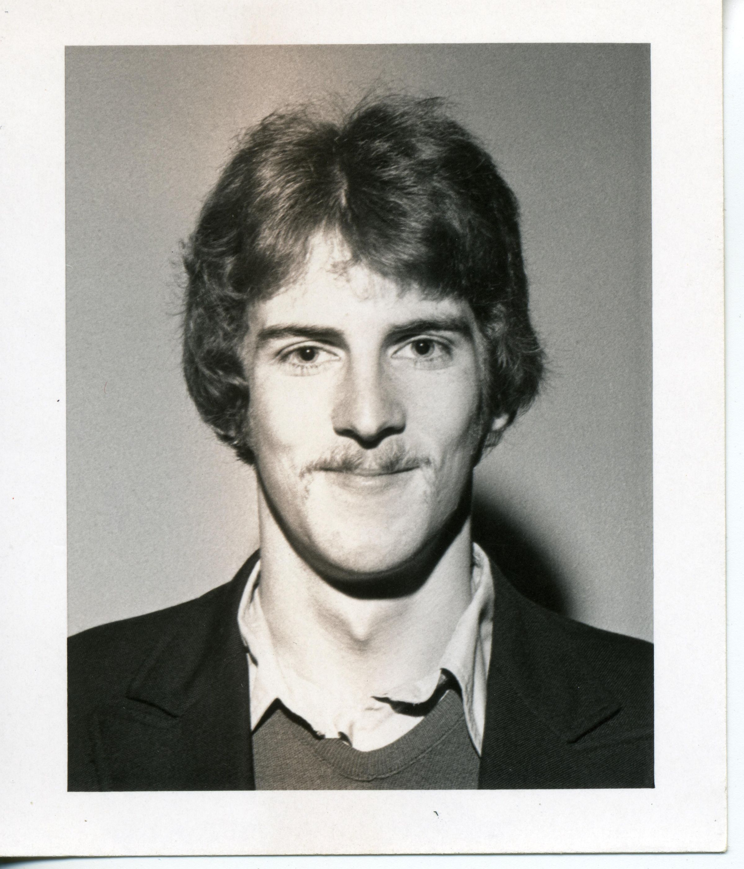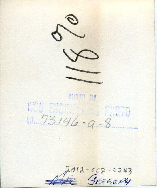 Black and white photo of a man named Gregory. The man has long dark hair, a slight mustache, and a prominent adam's apple. He is wearing a dark jacket over a gray sweater and a white shirt. There is a white border on all sides. On the back in ink is "118%", "Mak [crossed out] Gregory", and a stamp that says "WSU [unreadable] PHOTO NO. [in pencil] 75146-a-8".