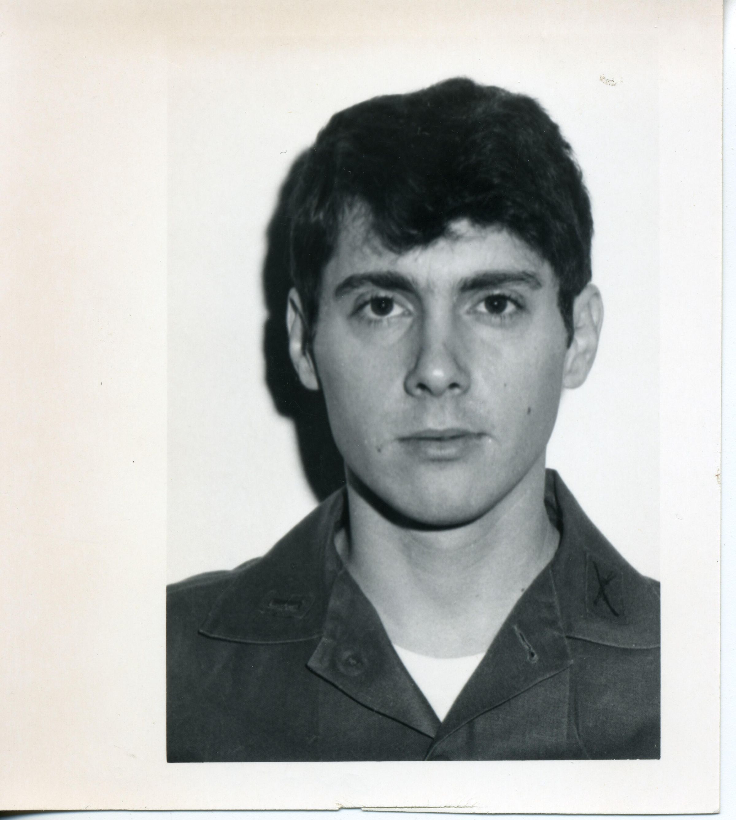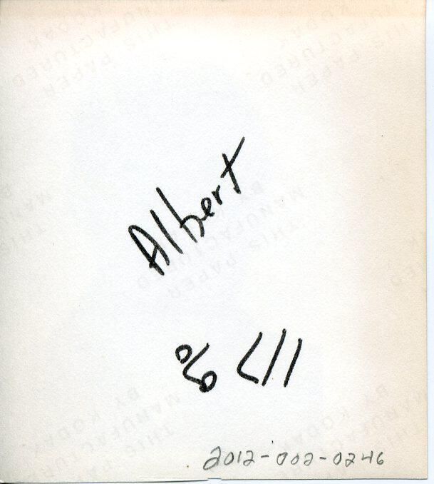 Black and white photo of a young man with dark hair. He is wearing a dark shirt that appears to be corduroy with what appears to be military images on the lapels. There is a white undershirt apparent beneath the dark shirt. There is a white border on all sides with a larger border on the left. On the back in black felt pen is "Albert" and "117%".