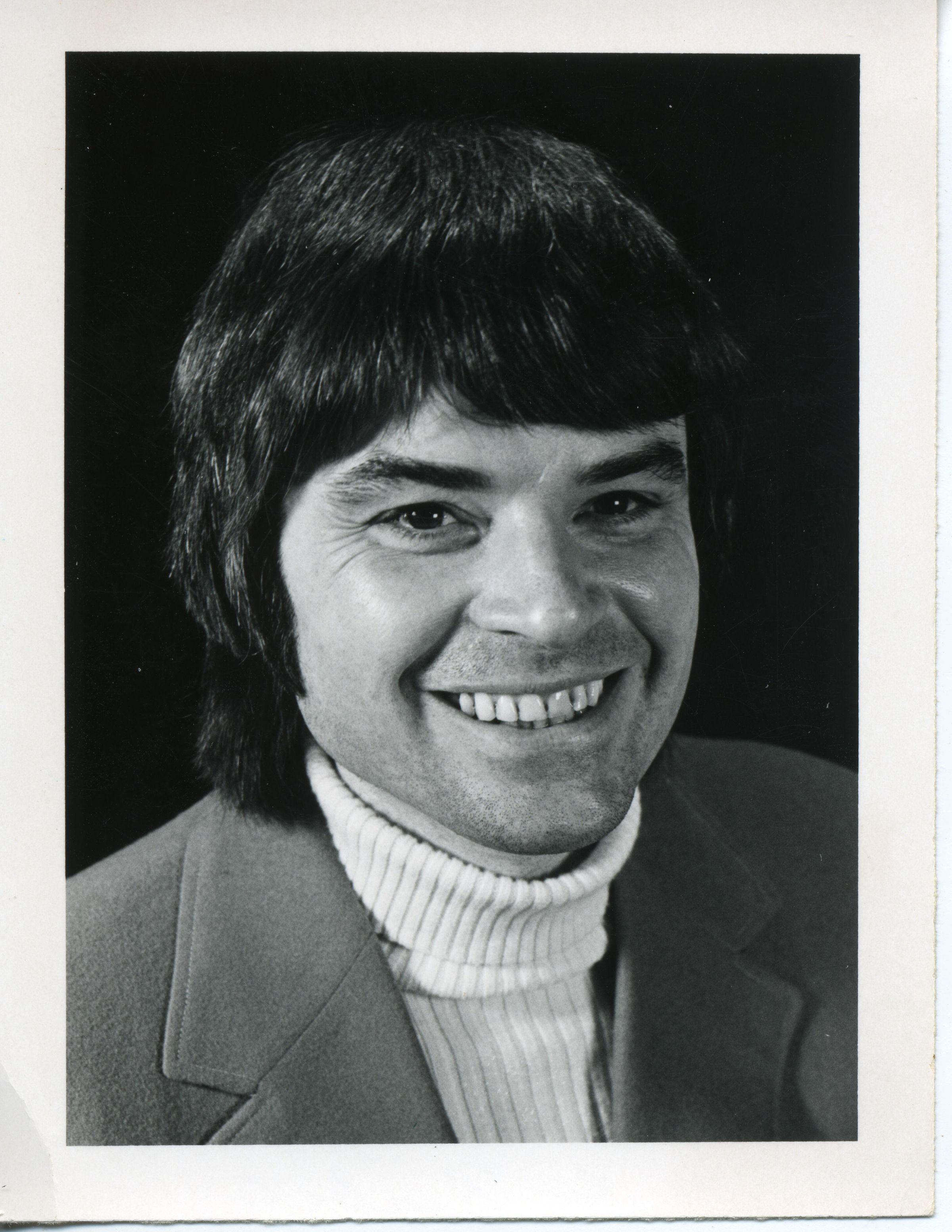 Black and white photo of a smiling Chuck Nisbet. He has dark hair that hangs to his shoulder, and is wearing a medium dark jacket over a white turtle neck knit shirt that is folded over at the collar. There is a white border on all sides. On the back in red ink is "Chuck Nisbet" and in pencil "C Nisbet"Made/Created