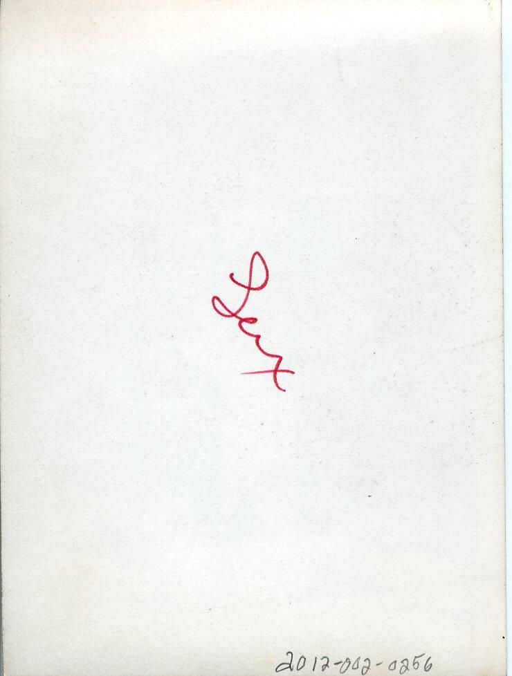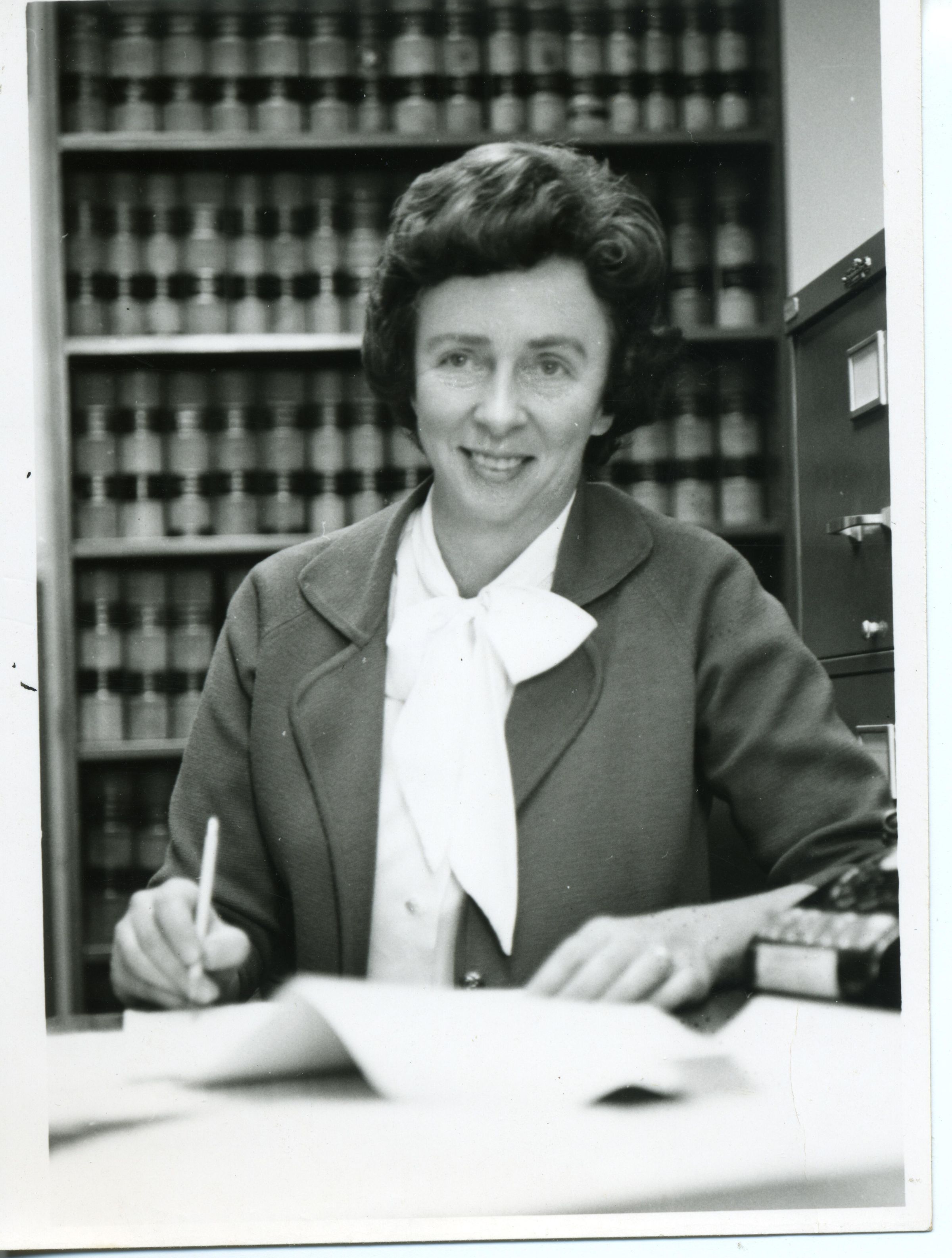 Black and white photo of smiling Mary Lux. She has dark hair and is wearing a dark jacket over a white blouse. She is sitting at a desk with a pencil in her right hand and with papers and a book on the desk before her. Behind her is a book case with law books. There is part of a filing cabinet visible on the right side of the photo. There is a white border on all sides. On the back in red ink is "Lux".