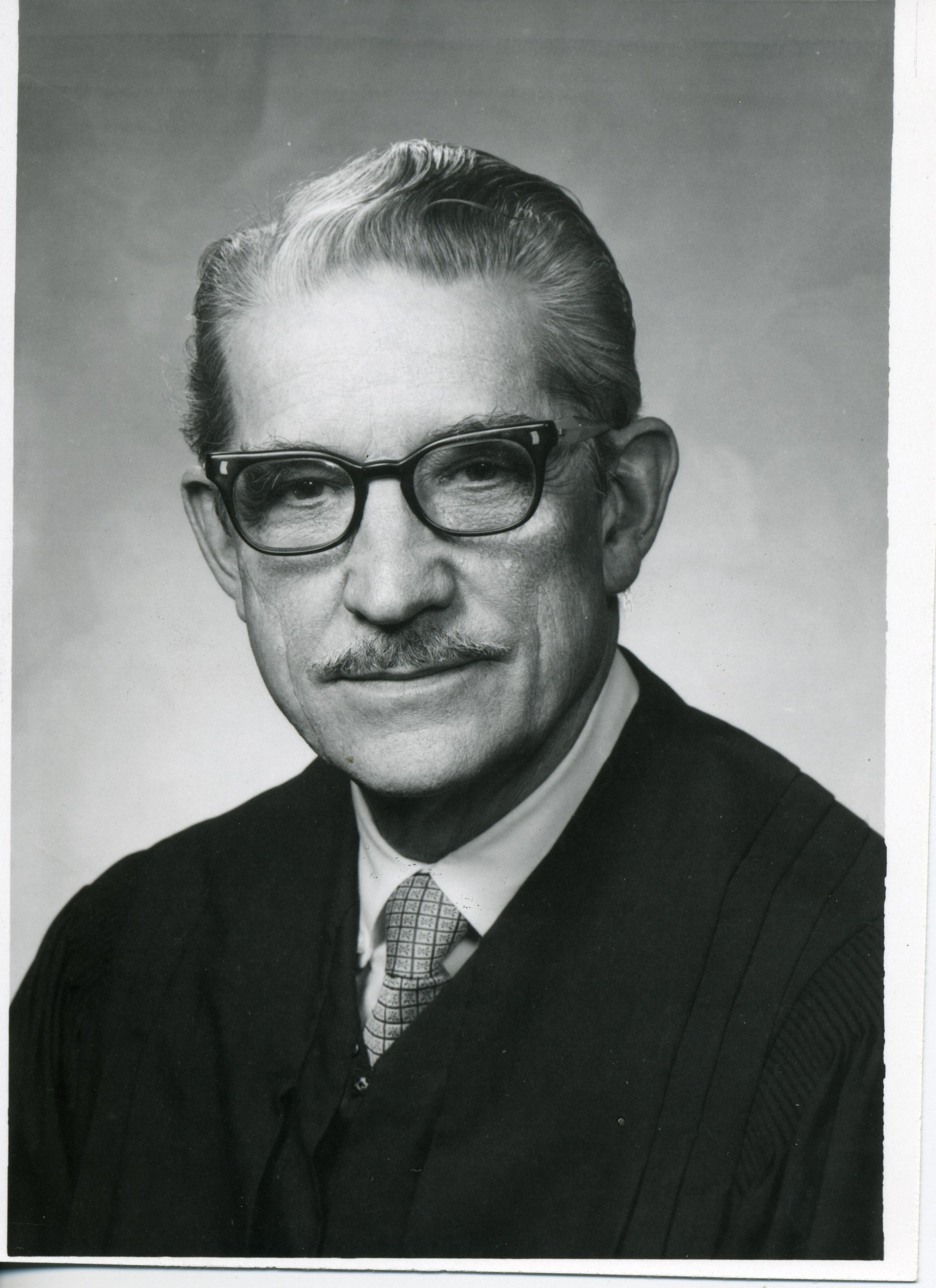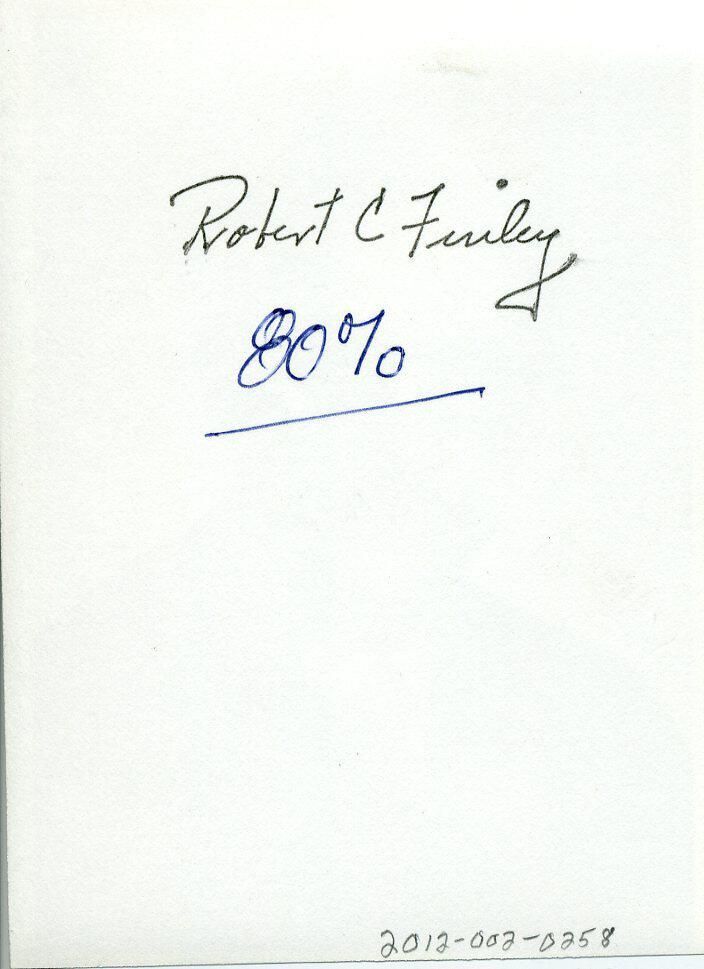 Black and white photo of Justice Robert C. Finlay. He has short gray hair. is wearing glasses, and has a slight mustache. He is wearing a judicial robe over a white shirt and a patterned tie. There is a white border on all sides. On the back in black ink is "Robert C. Finley" and in blue ink "80%".