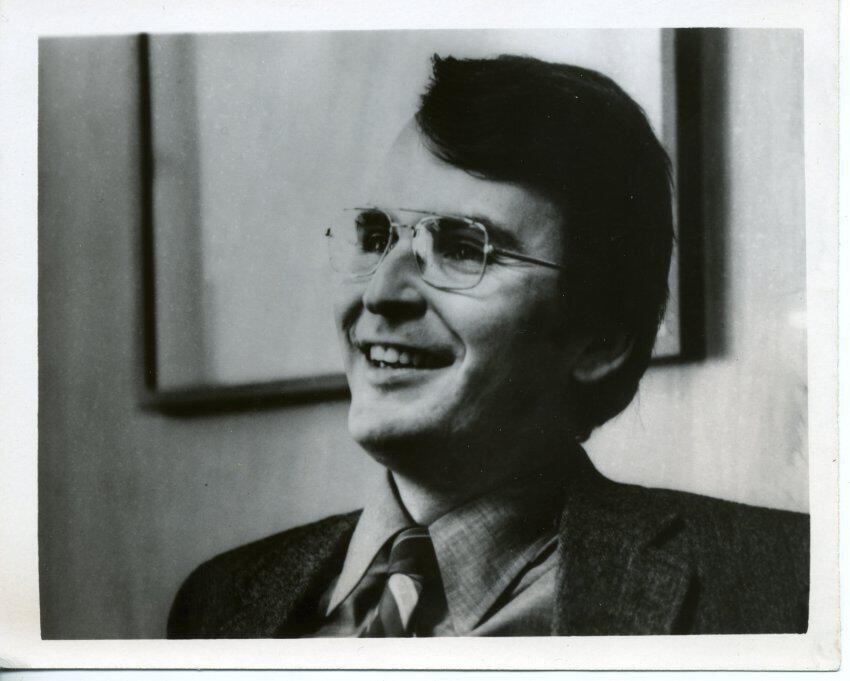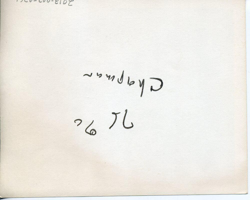 Black and white photo of a smiling man with dark hair and wearing glasses. He has on a suit coat, a patterned shirt , and a striped tie. There is a picture frame visible in the back ground that is out of focus. There is a white border on all sides. On the back is "76%" and "Chapman".