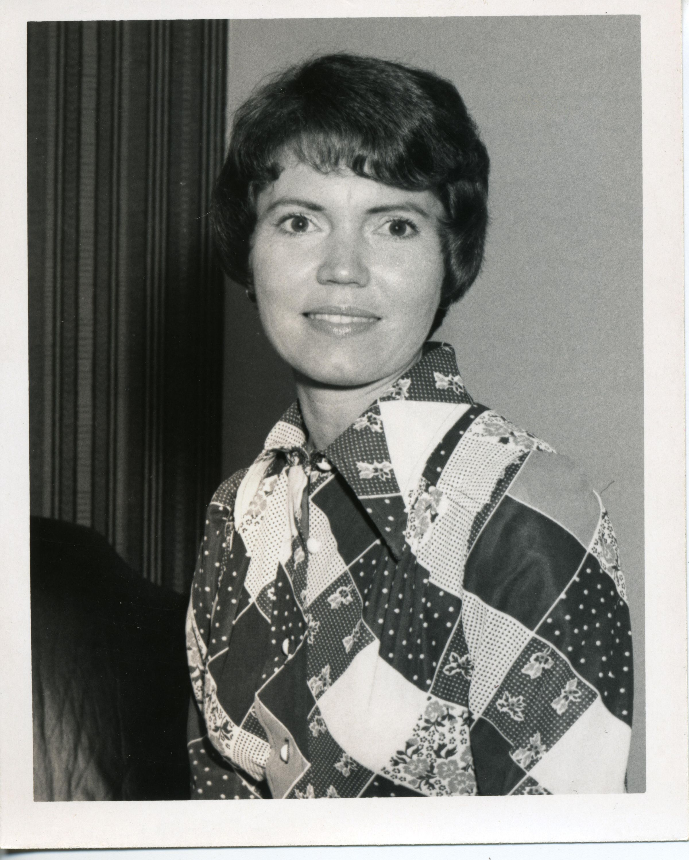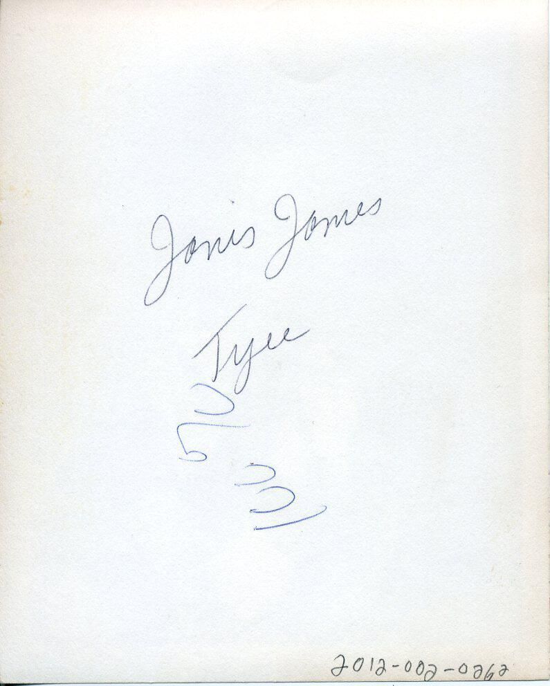 Black and white photo of a young woman with medium length dark hair. She is wearing a shirt or dress with a crazy-patch design. In the background appears to be a window drape on one side of the photo. There is a white border on all sides. On the back is "Janis Jones Tyee" and "100%".