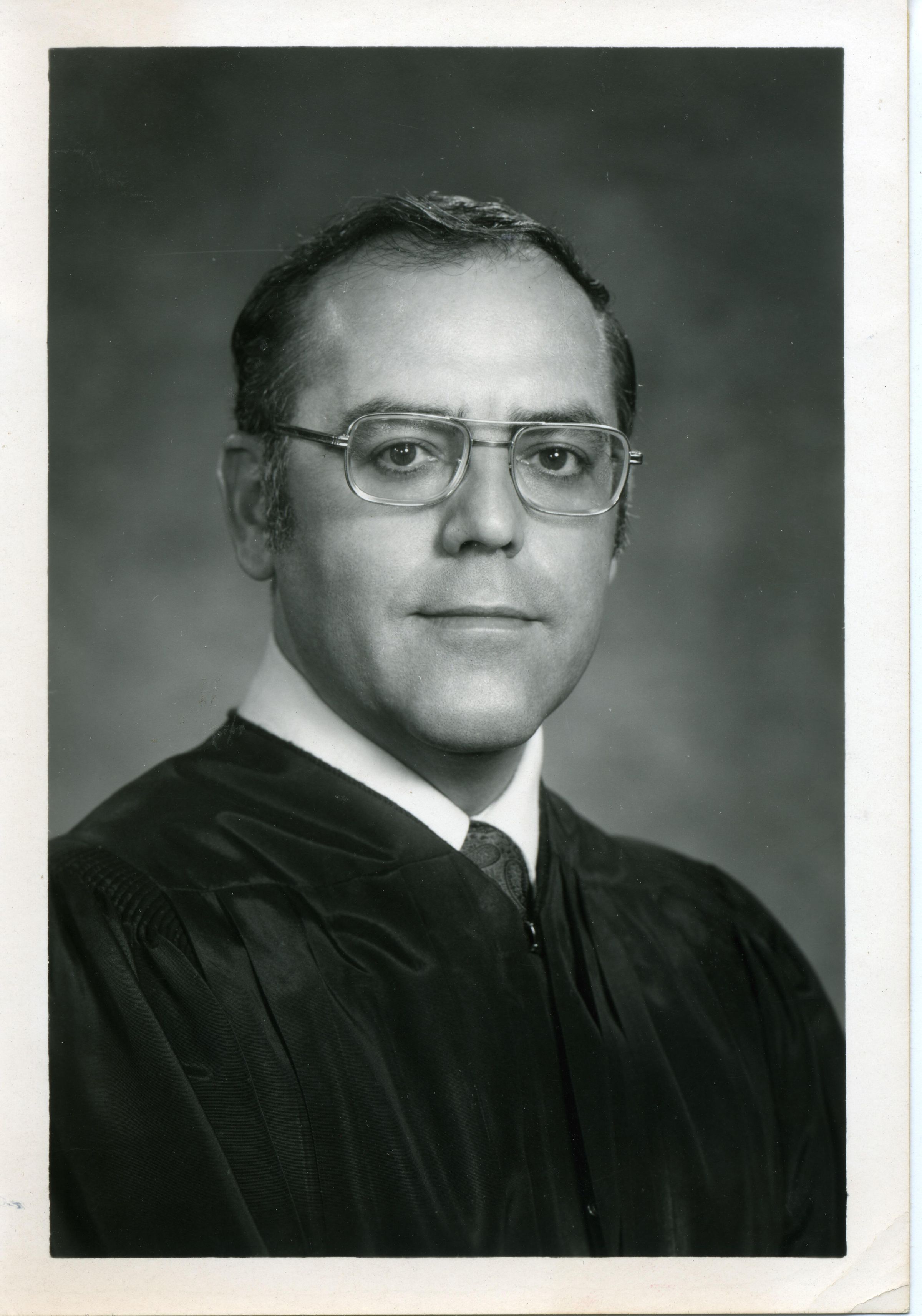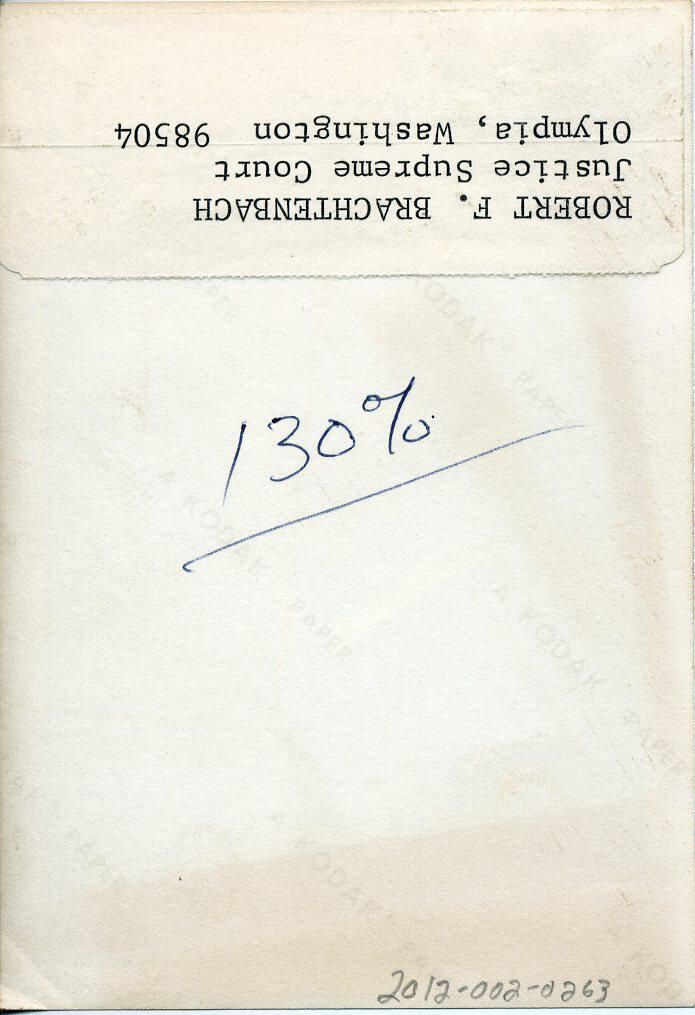 Black and white photo of Robert F. Brachtenbach. He has short dark hair and is wearing glasses. He has on a judicial robe over a white shirt and dark tie. There is a white border on all sides. On the back is in ink "130%" and typed on a pasted-on paper is"Robert F. Brachtenbach, Justice Supreme Court, Olympia, Washington 98504".
