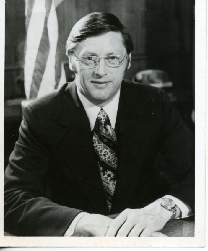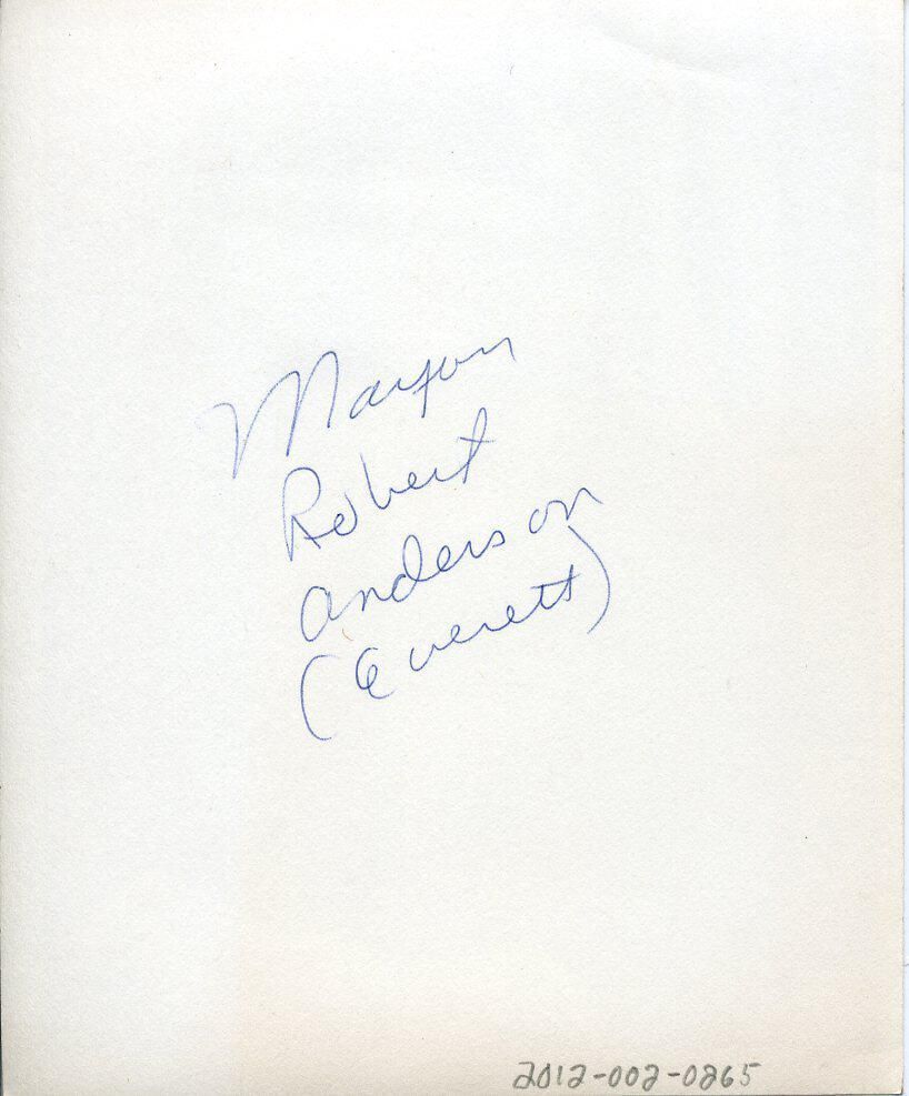 Black and white photo of Robert Anderson. He has dark hair and is wearing glasses. He has on a dark suit over a white shirt and a patterned tie. A watch is visible on his wrist. Behind him is an American flag and a telephone. There is a white border on all sides. On the back in ink is "Mayor Robert Anderson (Everett)".Made/Created