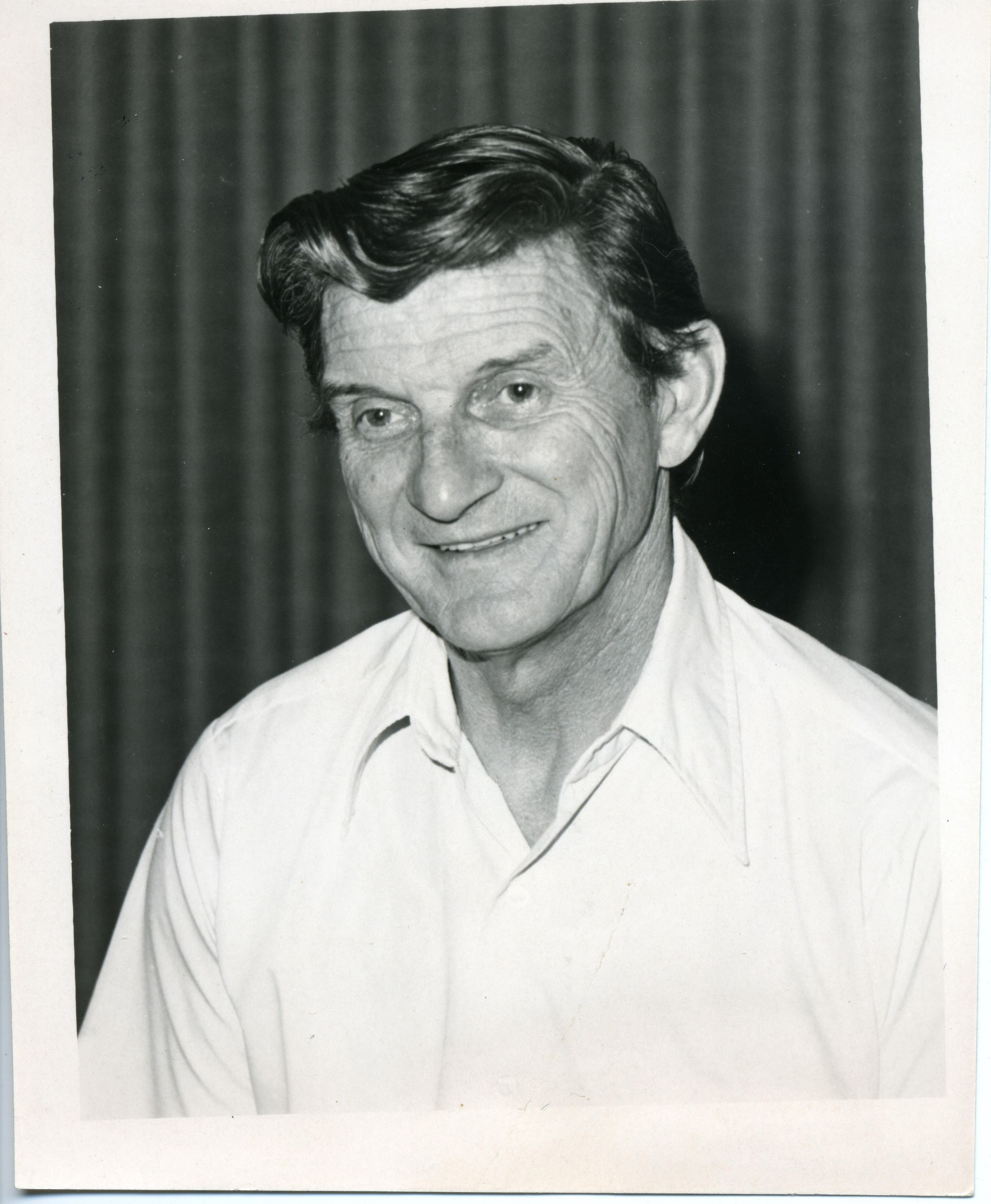 Black and white photo of Harry Elway. He has short dark hair and is wearing a white shirt with an open collar. There is a striped wallpaper behind him. There is a white border on all sides. On the back in ink is "101%" and the same pen has crossed out "108% Elway" written in green felt pen. In pencil is written "Harry Elway".