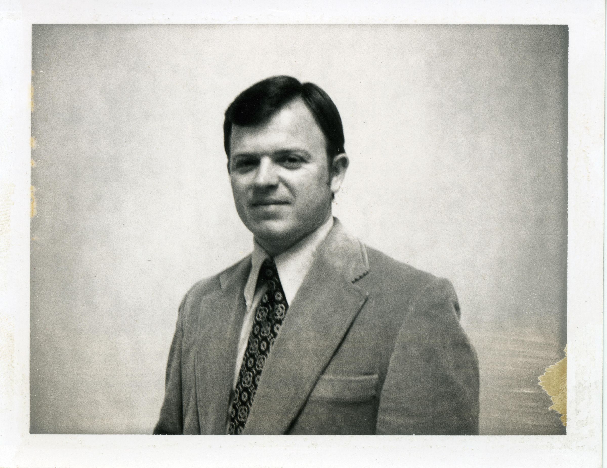 Black and white photo of Jim Sheler. He has medium length dark hair and is wearing a suit coat, a white shirt, and a patterned tie. There is a white border on all sides. On the back in red ink is "Jim Sheler".Made/Created