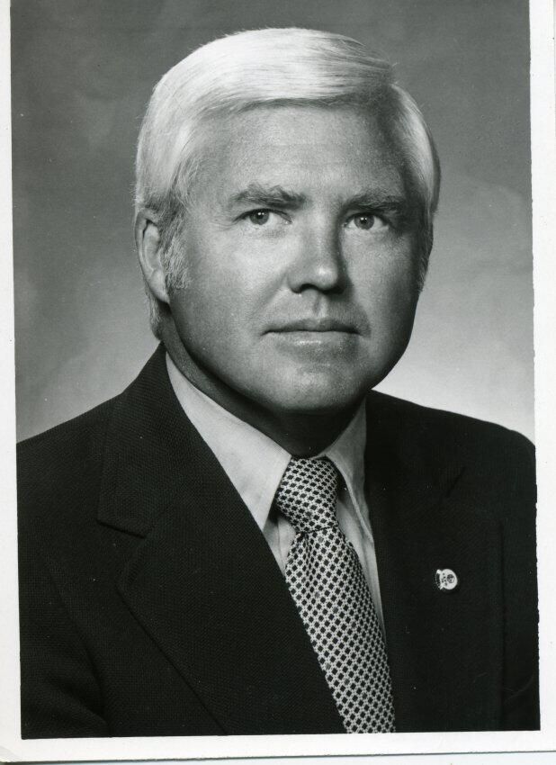 Black and white photo of Charles Odegaard. He has white hair and is wearing a dark suit, a white shirt, and a patterned tie. He has a membership-type button in his lapel. There is a white border on all sides. On the back in pencil is "Charles H. Odegaard" and typed is "Washington State Parks and Recreation Commission Public Information Office P. O. Box 1128 Olympia, Wa. 98504".