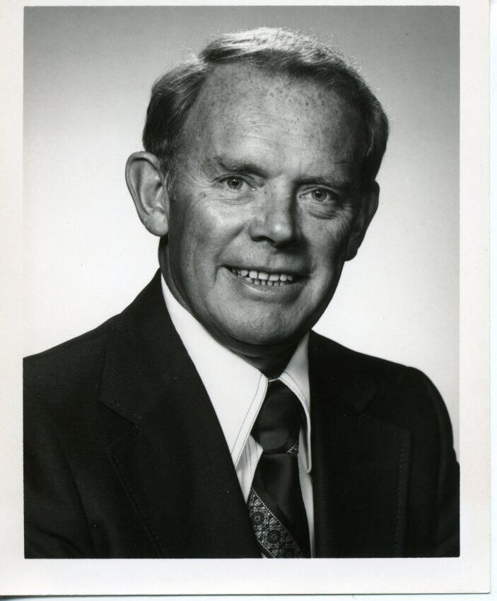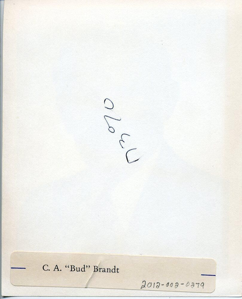 Black and white photo of a smiling Bud Brandt. He has short light-colored hair and is wearing a dark suit over a white shirt and dark patterned tie. There is a white border on all sides. On the back is in ink "73%", and on a pasted slip of paper "C. A. "Bud" Brandt".