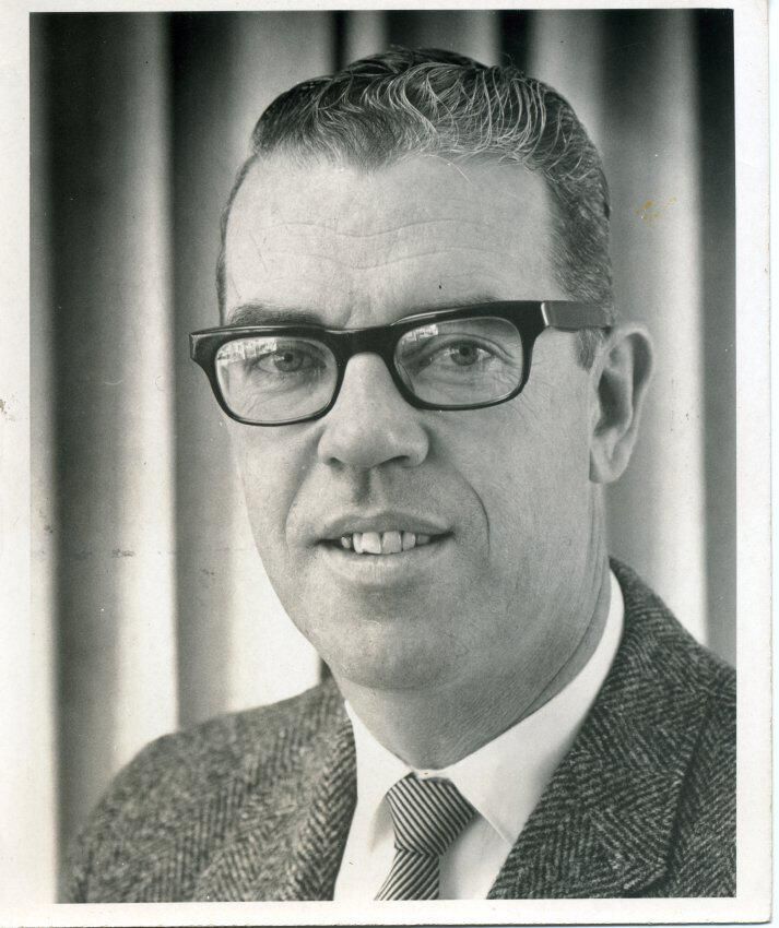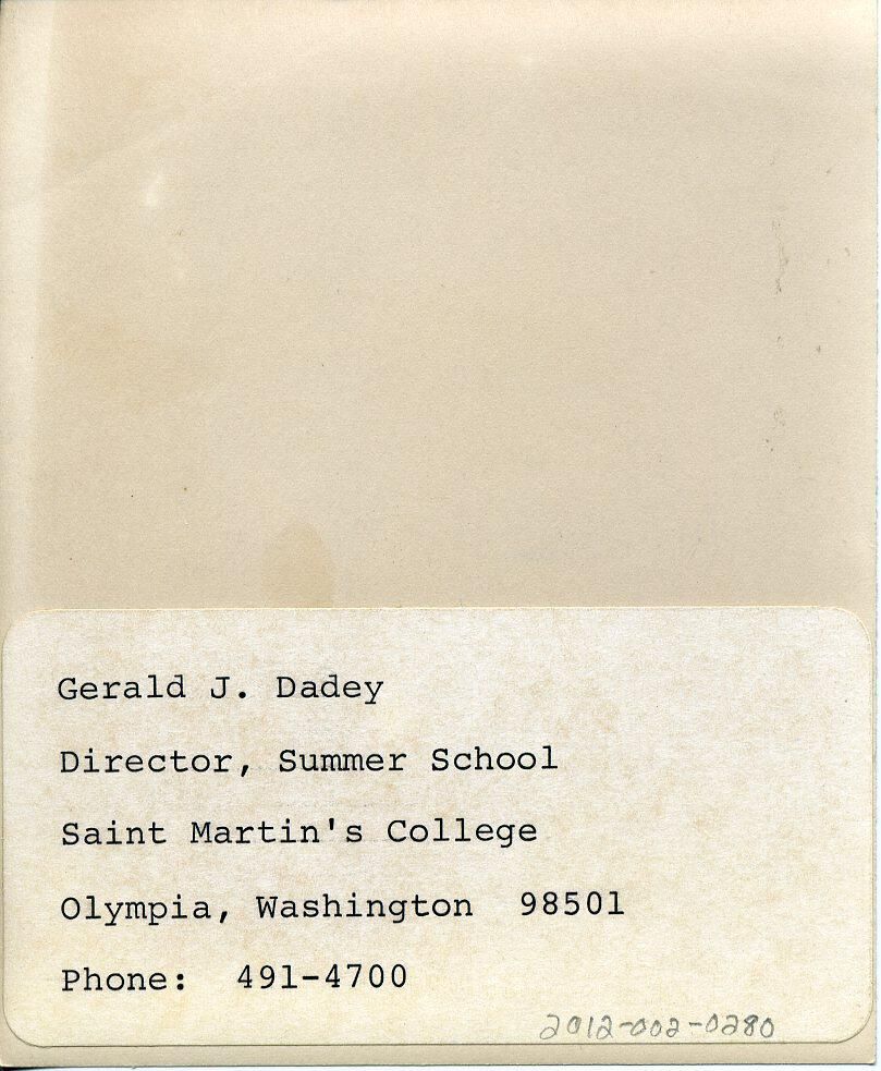 Black and white photo of Gerald Dadey. He has short medium-dark hair and is wearing glasses. He has on a Herringbone jacket over a white shirt and a patterned tie. In the background is a textured wall. There is a white border on all sides. On the back on a pasted-on piece of paper is typed "Gerald J. Dadey, Director, Summer School, Saint Martin's College, Olympia, Washington 98501, Phone: 491-4700".Made/Created