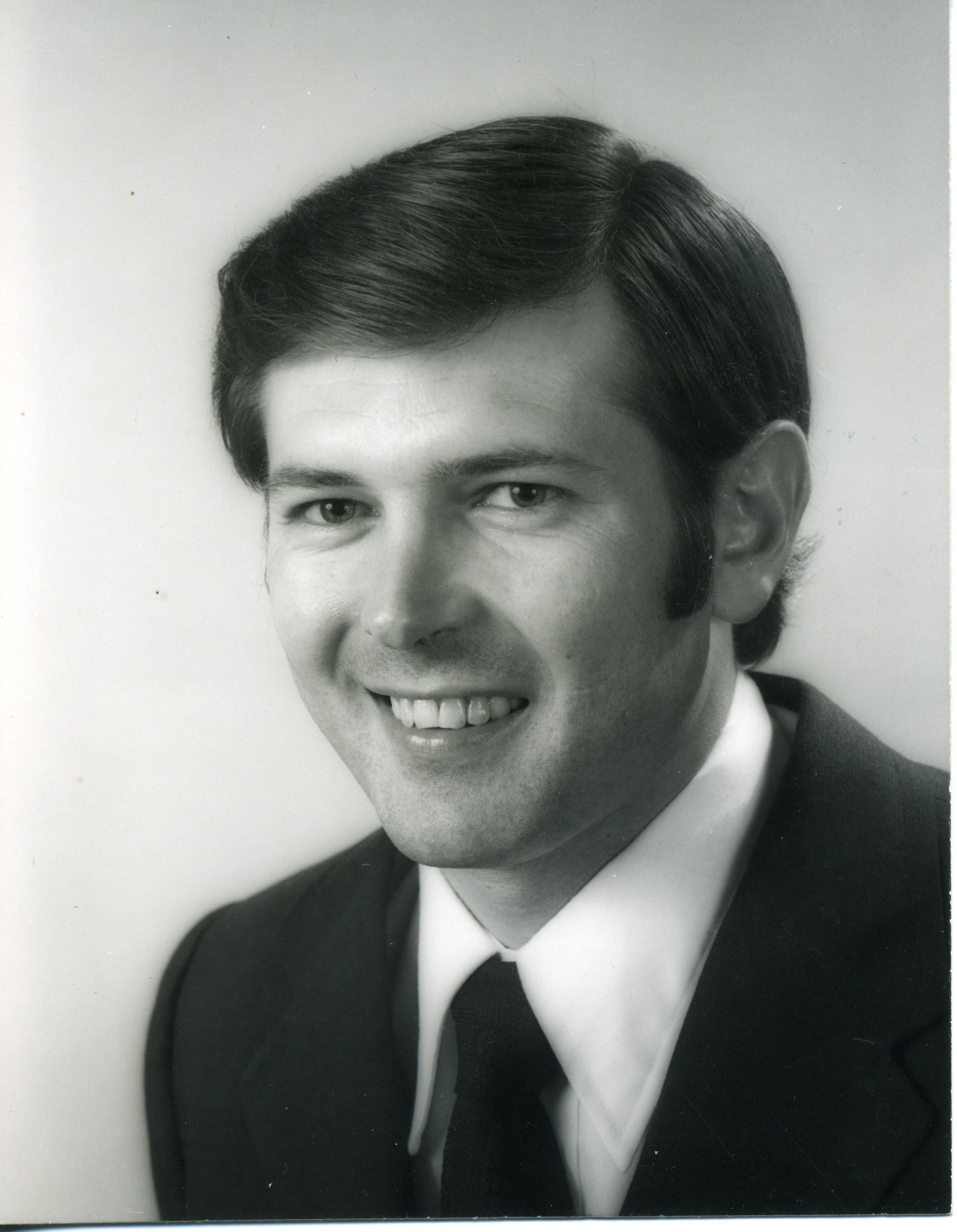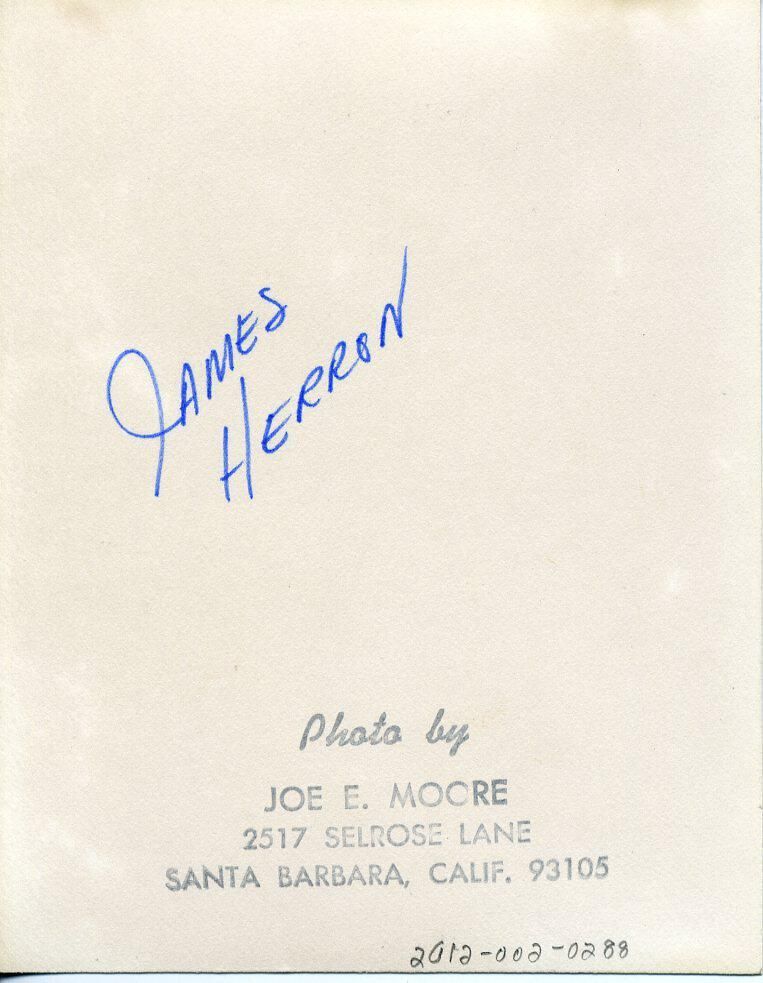 Black and white photo of a smiling James Herron. He has dark hair and is wearing a dark suit over a white shirt and a dark tie. There are no borders. On the back in ink is "James Herron", and a stamped image that says "Photo by Joe E. Moore, 2517 Selrose Lane. Santa Barbara, Calif. 93105".Made/Created
