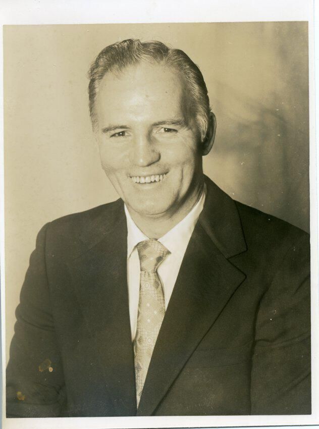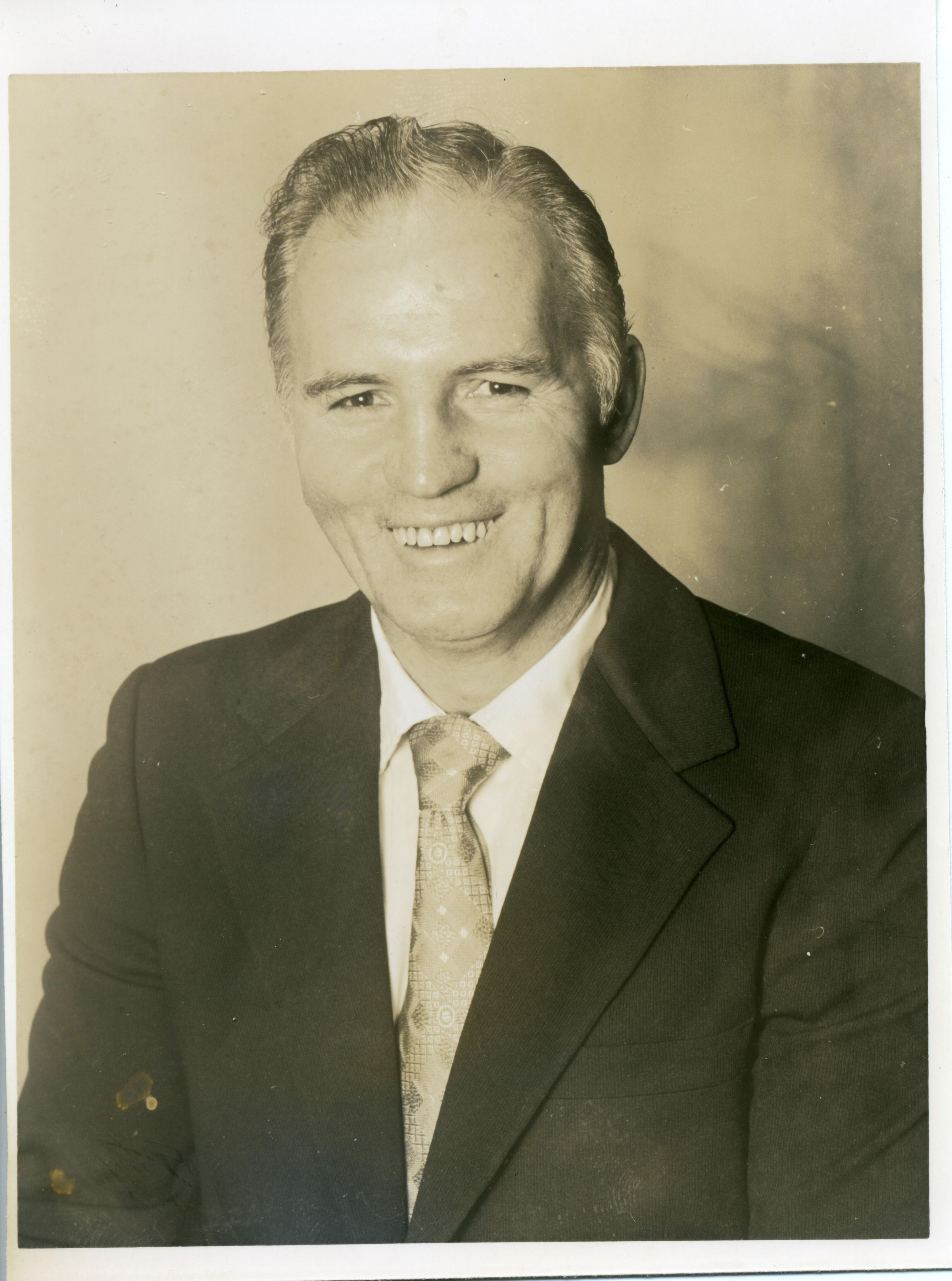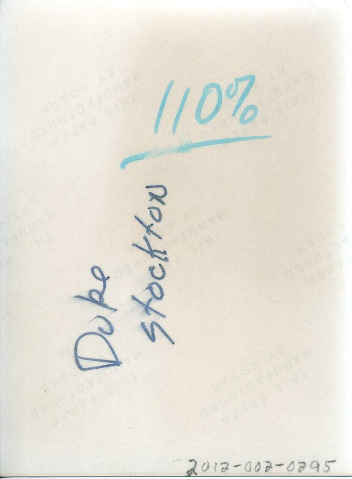Black and white photo of a smiling Duke Stockton. He has short dark hair and is wearing a dark suit over a white shirt and a light patterned tie. There is a white border on all sides with the top border being larger. On the back in blue felt pen is "110%" and in ink is "Duke Stockton".