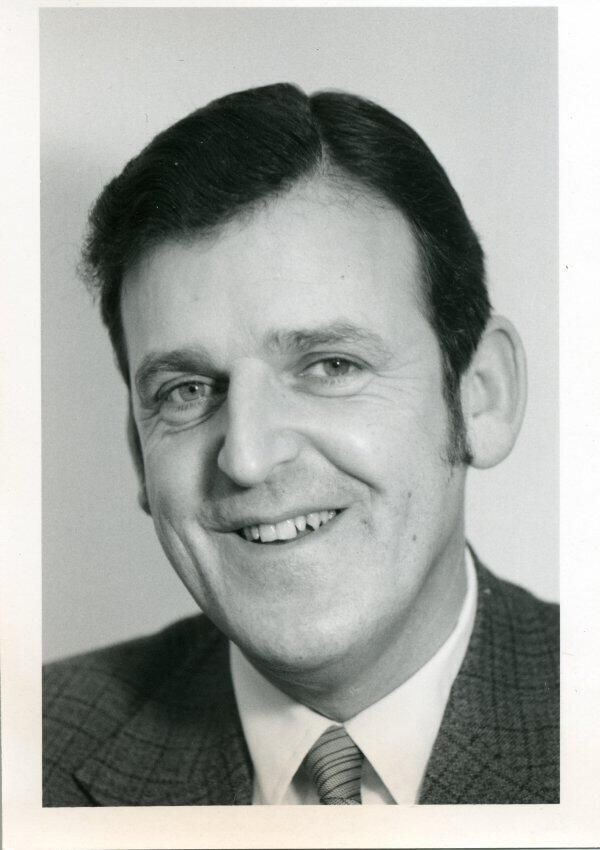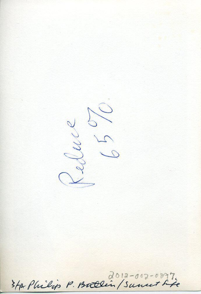 Black and white photo of a smiling Philip Batlin. He has short dark hair and is wearing a patterned coat over a white shirt and a striped tie. There is a white border on all sides. On the back in ink is "Reduce 65%" and in different ink "3/74 Philip P. Batlin/Sunset Life".