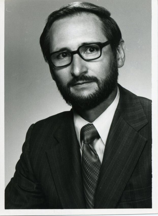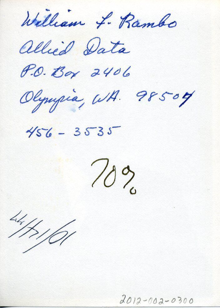 Black and white photo of William F. Rambo. He has dark hair, is wearing glasses, and has a full beard and mustache. He has on a dark suit coat with a faint stripe over a white shirt and a tie with a striped pattern. There is a white border on all sides. On the back in blue ink is "William R. Rambo, Allied Data, P.O. Box 2406, Olympia, WA 98504", and in a different color ink "70%" and "10/14/77".Made/Created