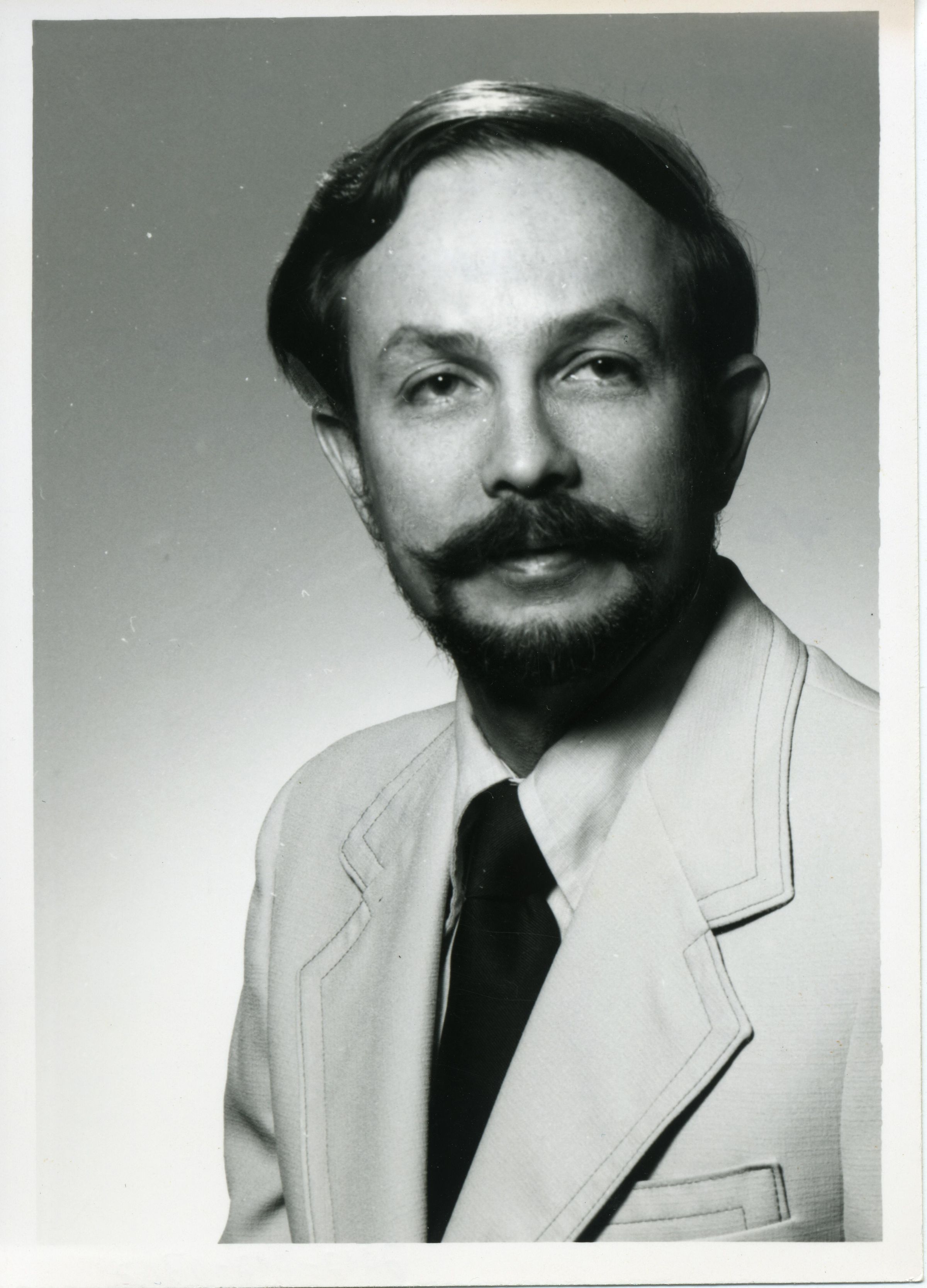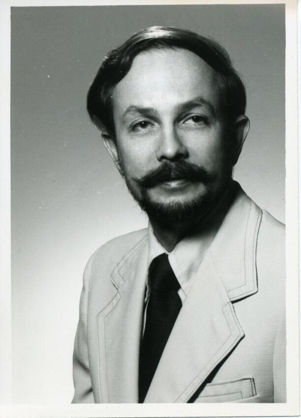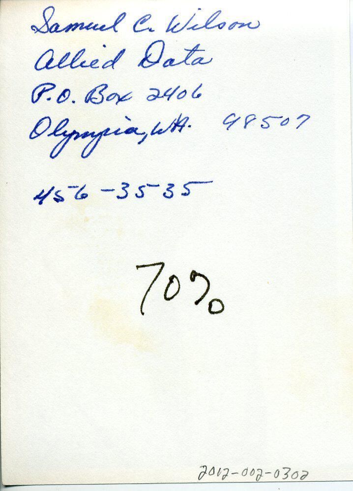Black and white photo of Samuel C. Wilson. He has dark hair and a full beard and mustache. He has on a light colored jacket over a white or tan shirt and dark tie. There is a white border on all sides. On the back in blue ink is "Samuel C. Wilson, Allied Data, P.O. Box 2406, Olympia, WA, 98507, 456-3535" and in a different color ink "70%".Made/Created