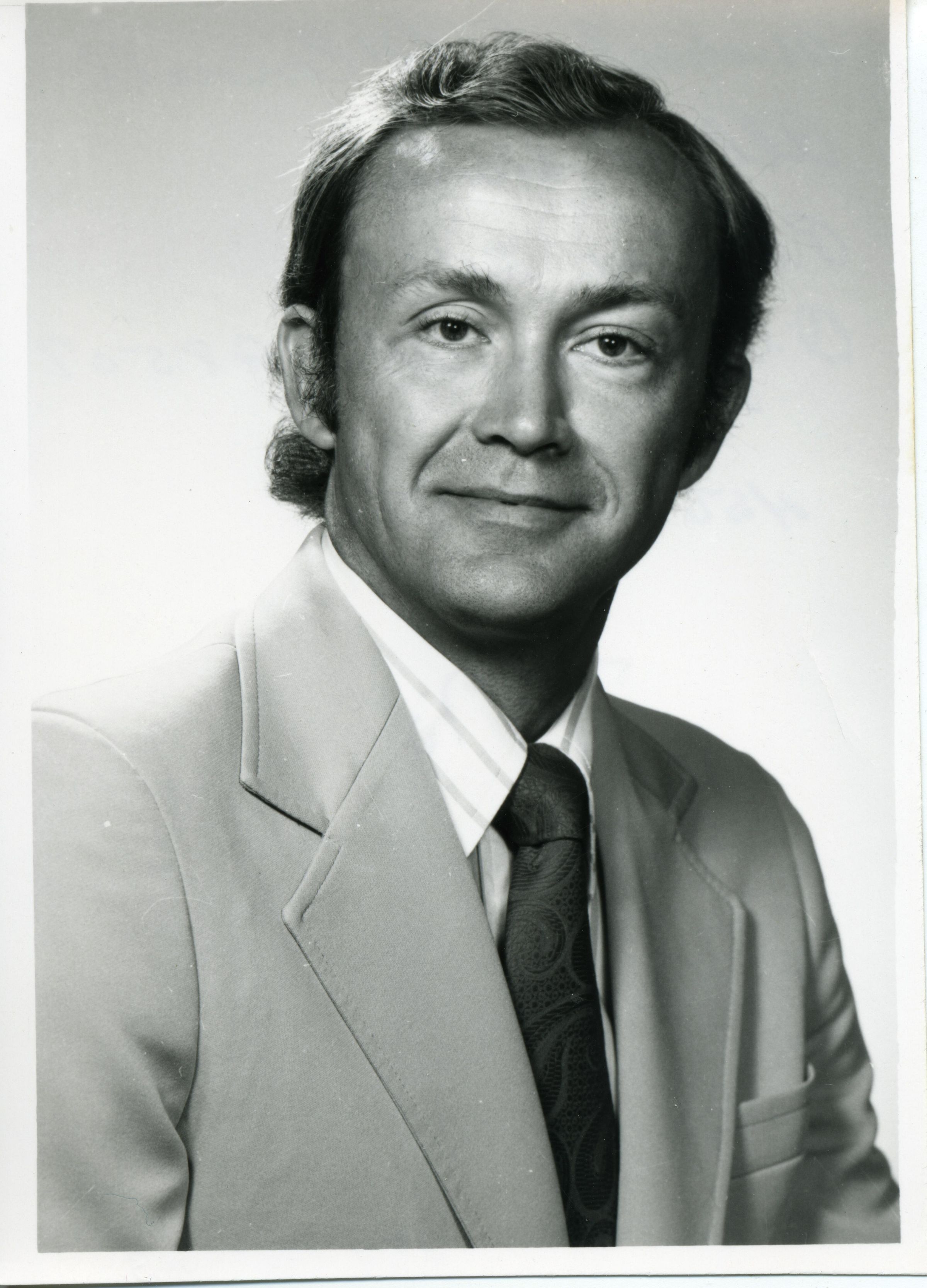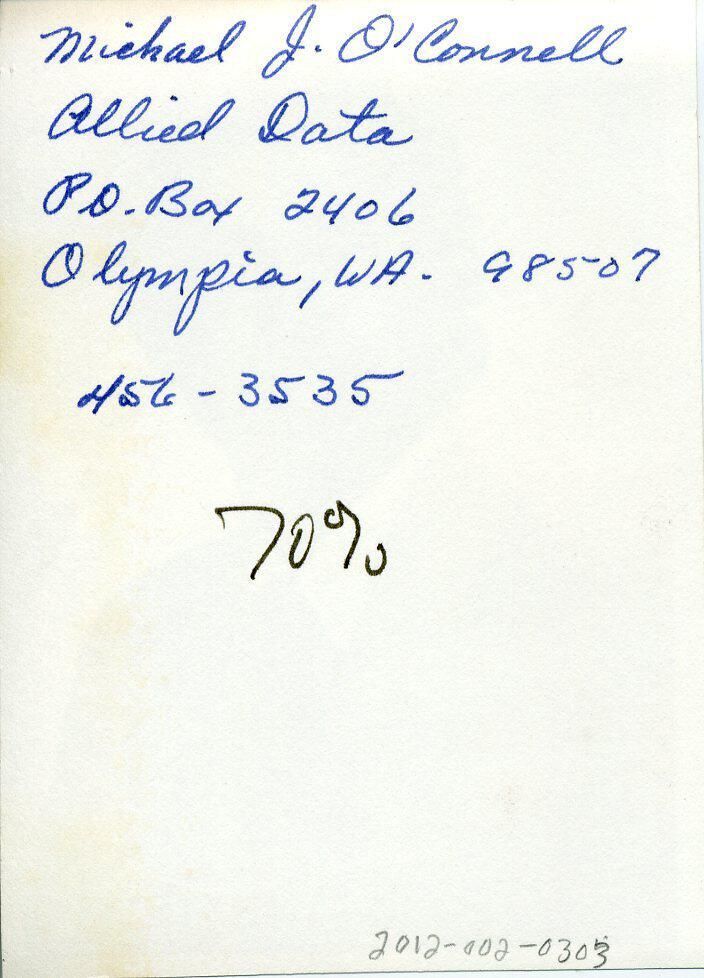 Black and white photo of Michael J. O'Connell. He has dark hair which falls below his ears and a receding hair line. He has on a light colored jacket over a white shirt with a stripe pattern and a dark tie. There is a white border on all sides. On the back in blue ink is "Michael J. O'Connell, Allied Data, P.O. Box 2406, Olympia, WA, 98507, 456-3535", and in a different color ink "70%".Made/Created