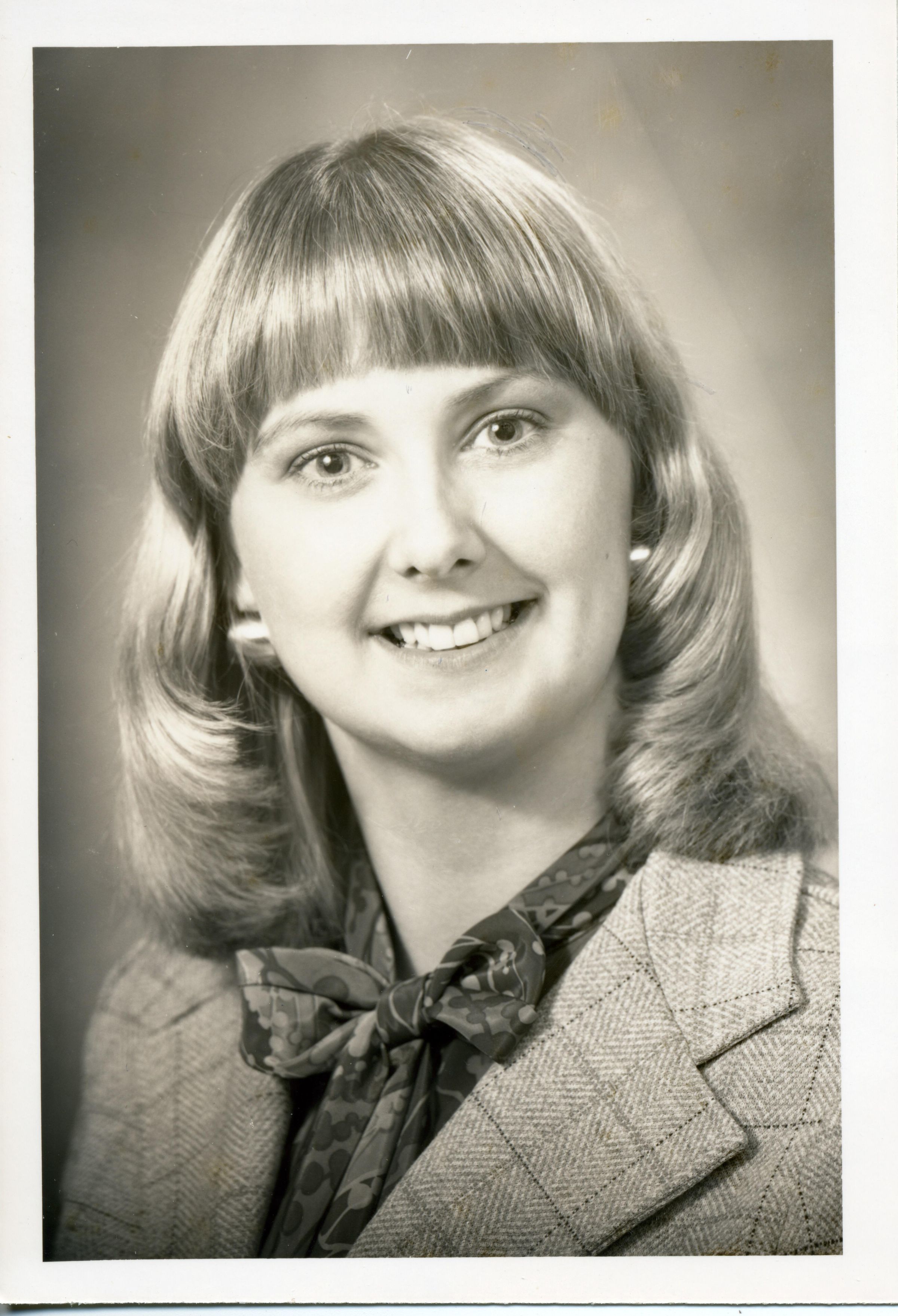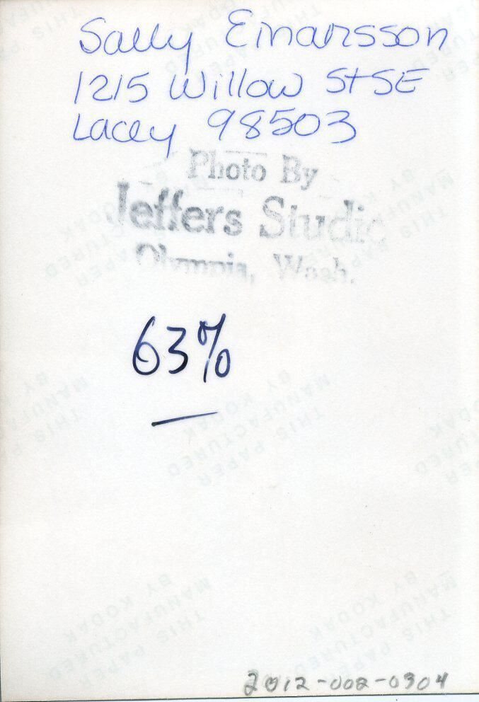 Sepia colored photo of a smiling Sally Emarsson. She has shoulder length light hair and is wearing ear rings and has on a light jacket that has a square pattern over a dark blouse that has a pattern and is tied in a bow at the collar. There is a white border on all sides. On the back in blue ink is printed "Sally Emarsson, 1215 Willow St SE, Lacey 98503". A stamp says "Jeffers Studio, Olympia, Wash" and written in blue ink is "63%". A very faint message is repeated across the back that says "This paper is manufactured by Kodak".Made/Created