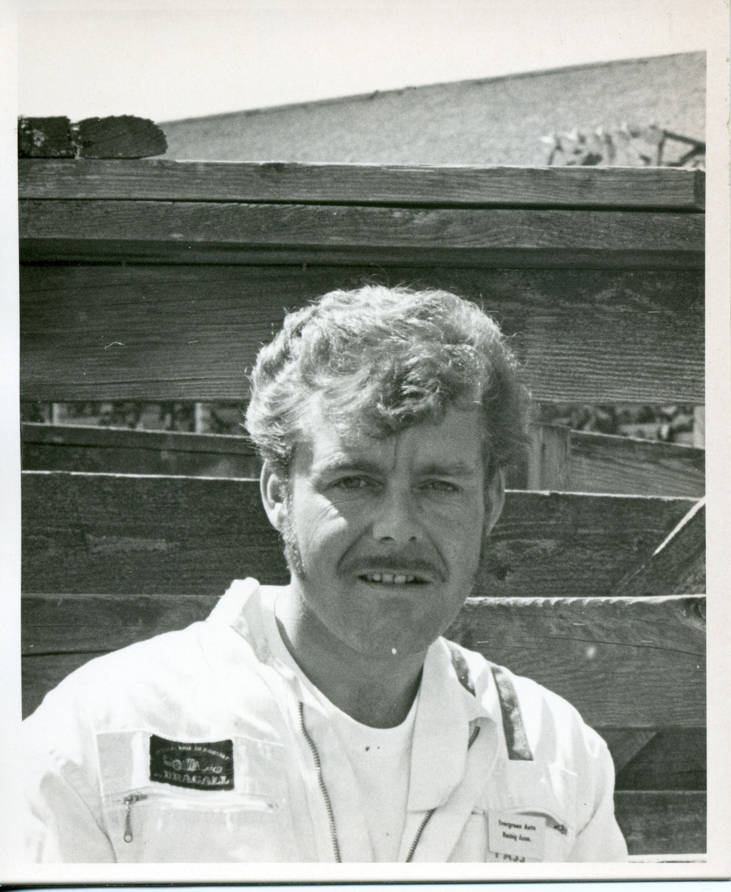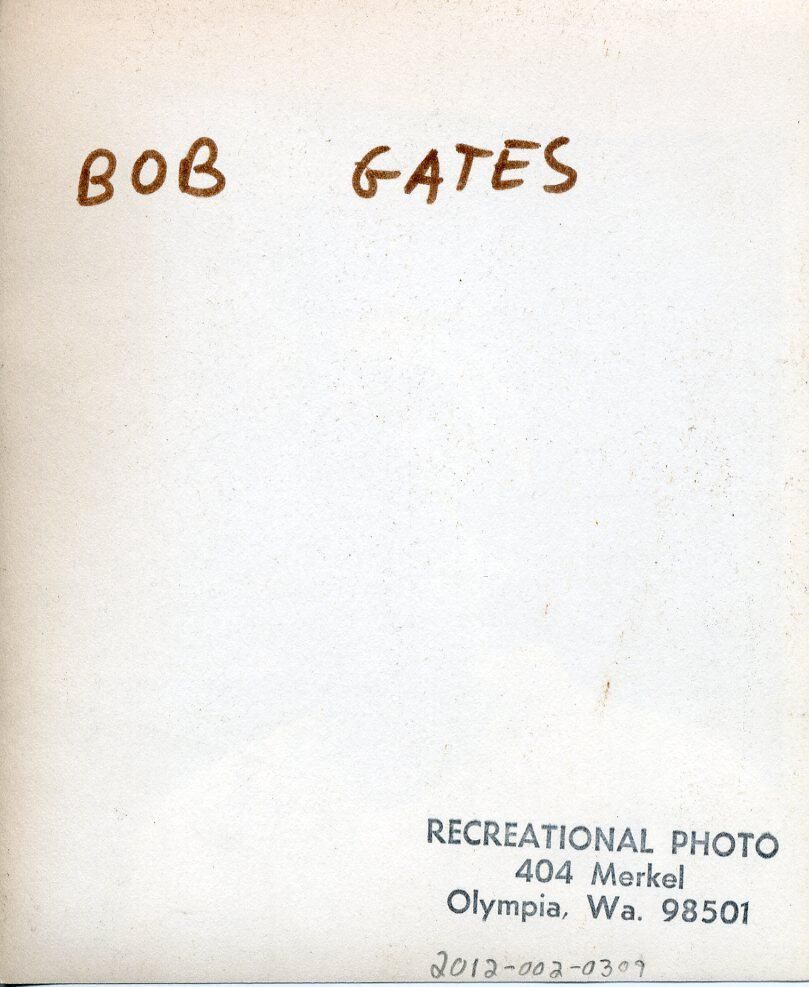 Black and white photo of Bob Gates. He has medium-dark hair and a mustache and sideburns. He is wearing a white coverall over a white tee shirt. On the cover-all is a black tag and a white tag, both with unreadable information. There is what appears to be a zipper on his outer garment. In the background are horizontal boards and braces and what appears to be rocky ground. On the back in red ink is "Bob Gates" and a stamp that says "Recreational Photo, 404 Merkel, Olympia, Wa. 98501".Made/Created
