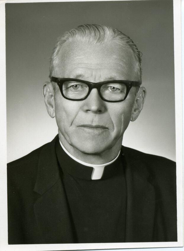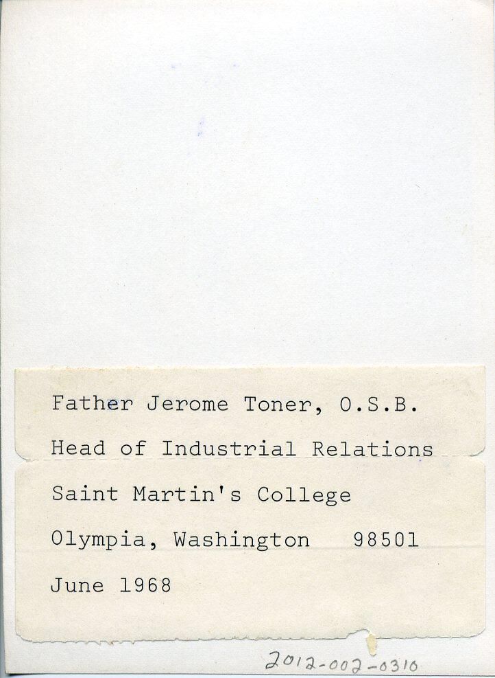 Black and white photo of Father Jerome Toner, O.S.B. He has white hair combed straight back and is wearing glasses. He has on a black jacket over a black vest and a white clerical collar. There is a white border on all sides. On the back, on a pasted on piece of paper, is "Father Jerome Toner, O.S.B. Head of Industrial Relations, Saint Martin's College, Olympia, Washington 98501, June 1968".Made/Created