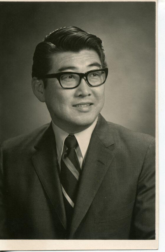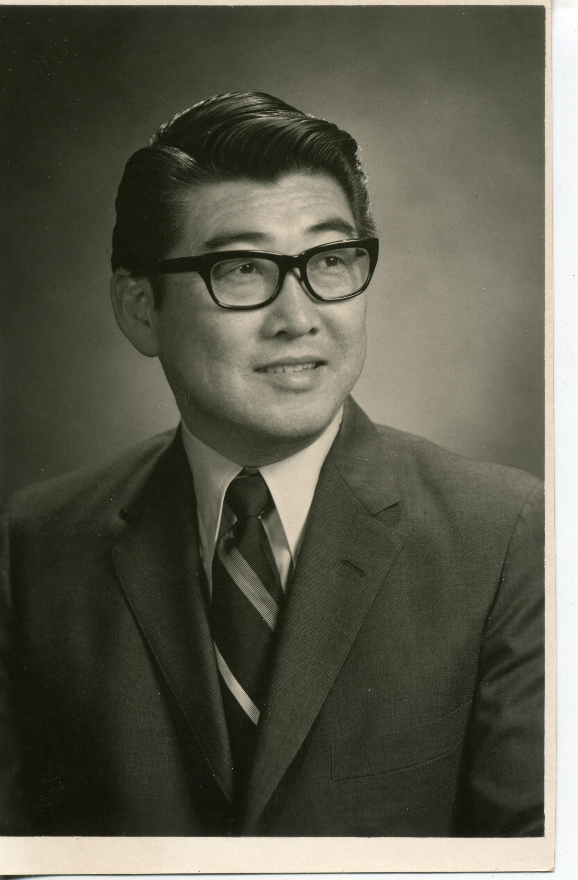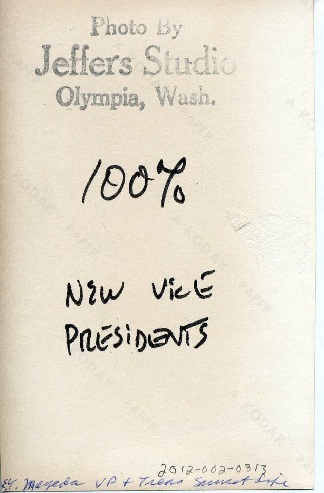 Black and white photo of E. Y. Mayeda. He has dark hair and is wearing glasses. He is wearing a dark suit over a white shirt and a striped tie. There is a white border on all sides with the bottom border being larger. On the back in ink is "100%" and "New Vice Presidents". In different ink at the bottom is "E. Y. Mayeda, VP and Treas, Sunset Life".Made/Created