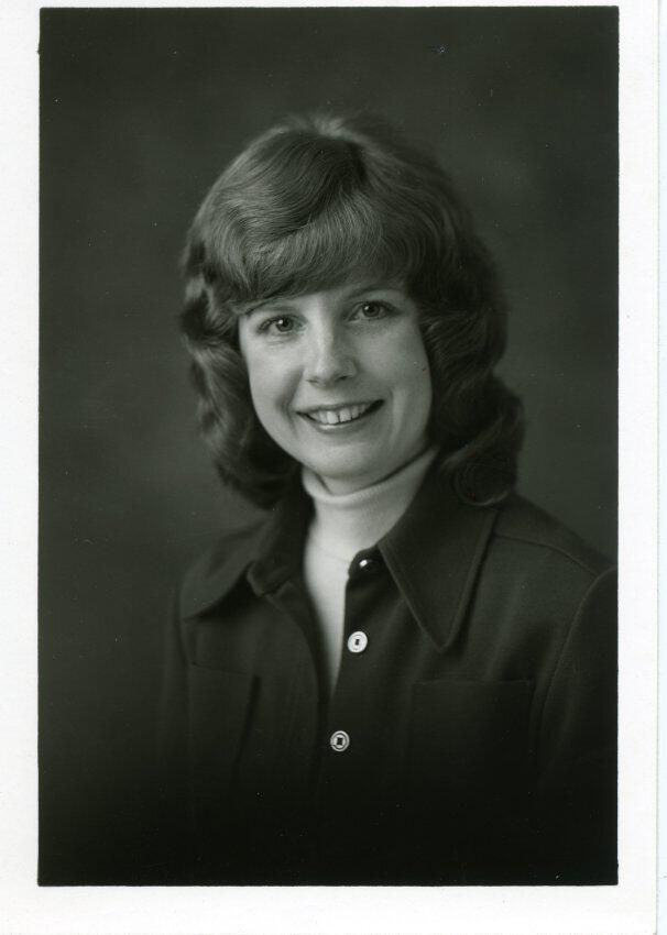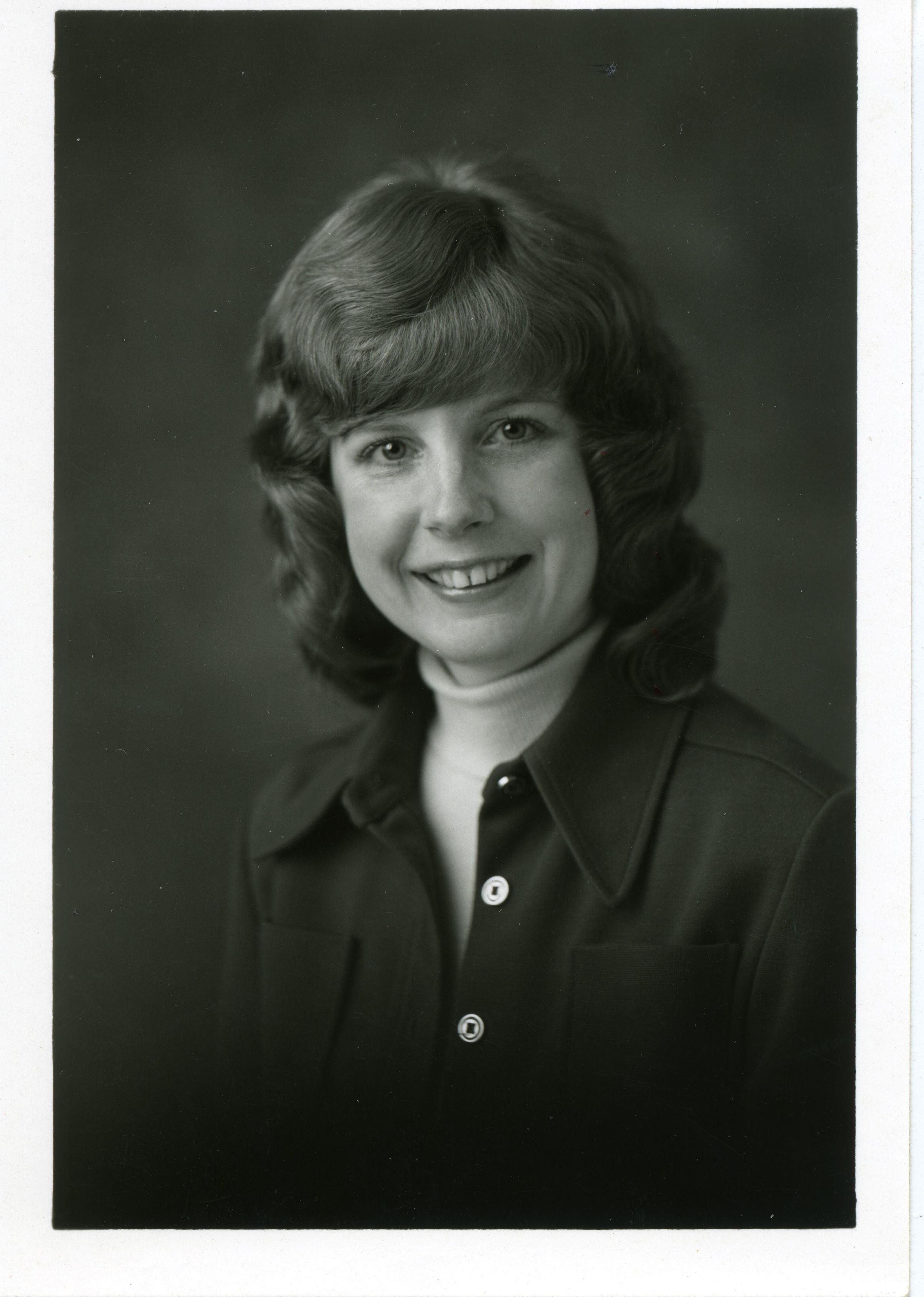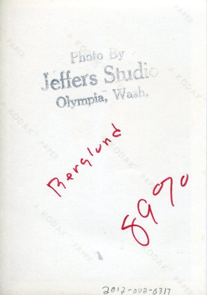 Black and white photo of a smiling Ann Berglund. She has a full head of dark hair that reaches to her shoulders. She is wearing a dark jacket over a white turtle-neck sweater. Buttons are visible on the jacket. There is a white border on all sides. On the back in red ink is "Berglund" and "89%". A stamp says "Photo by Jeffer's Studio Olympia, Wash.".Made/Created