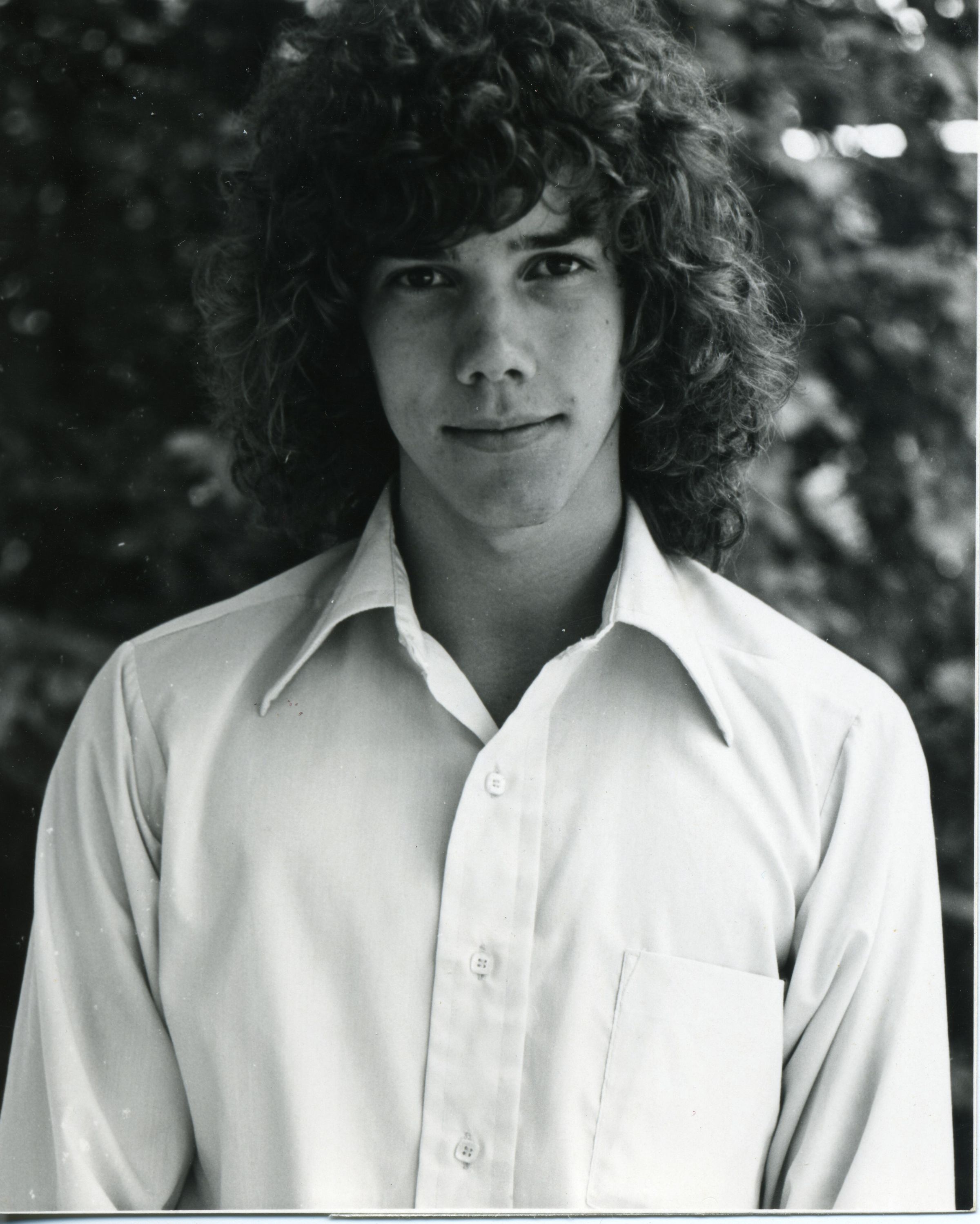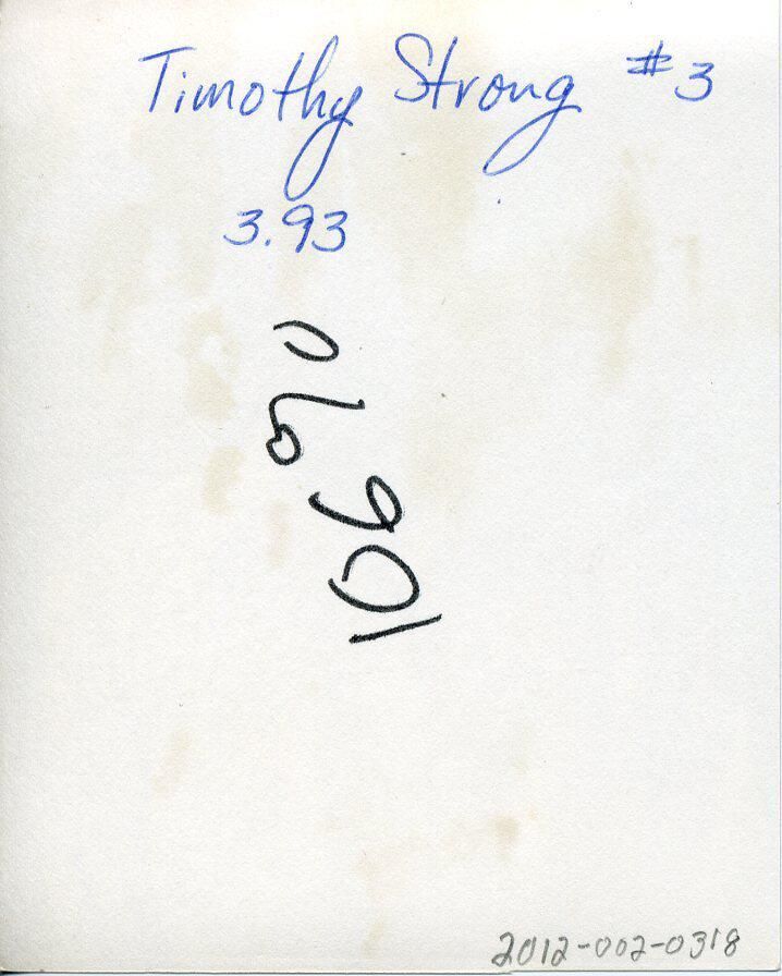 Black and white photo of Timothy Strong. He has dark curly hair that falls to his shoulders. He is wearing a white shirt, open at the collar, with buttons and a pocket visible. In the background is foliage. There is no border. On the back in ink is "Timothy Strong #3 3.93" and in felt pen "106%".Made/Created