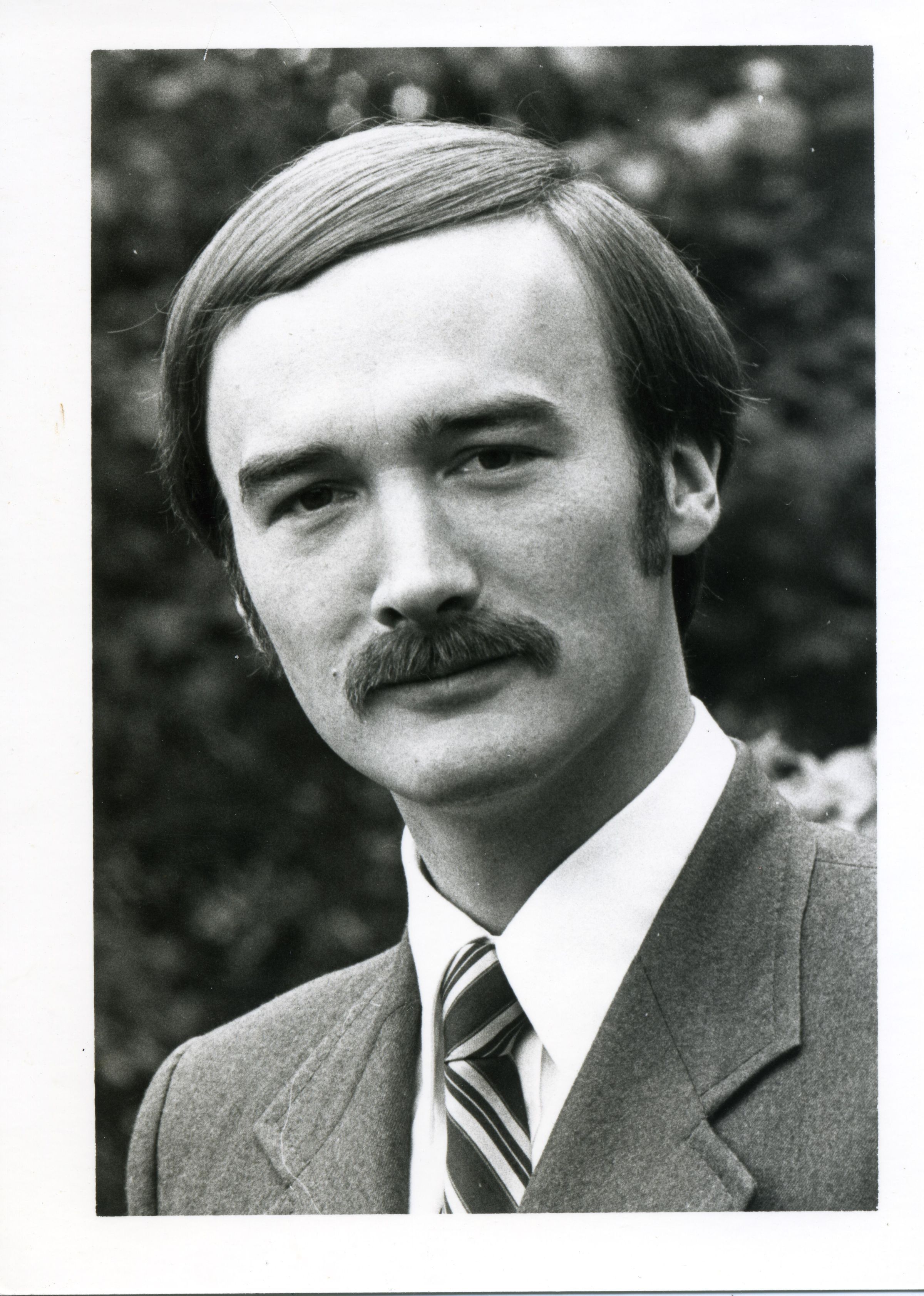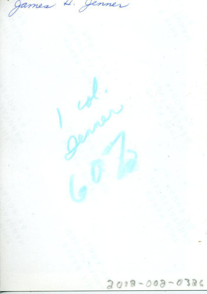 Black and white photo of James Jenner. He has medium dark hair that extends to his ears and down his cheek. He has a mustache and is wearing a dark suit over a white shirt and a striped tie. There is foliage in the background. There is a white border on all sides. On the back in blue ink is ';James H. Jenner" and in blue felt pen "1 col. Jenner 60%".Made/Created