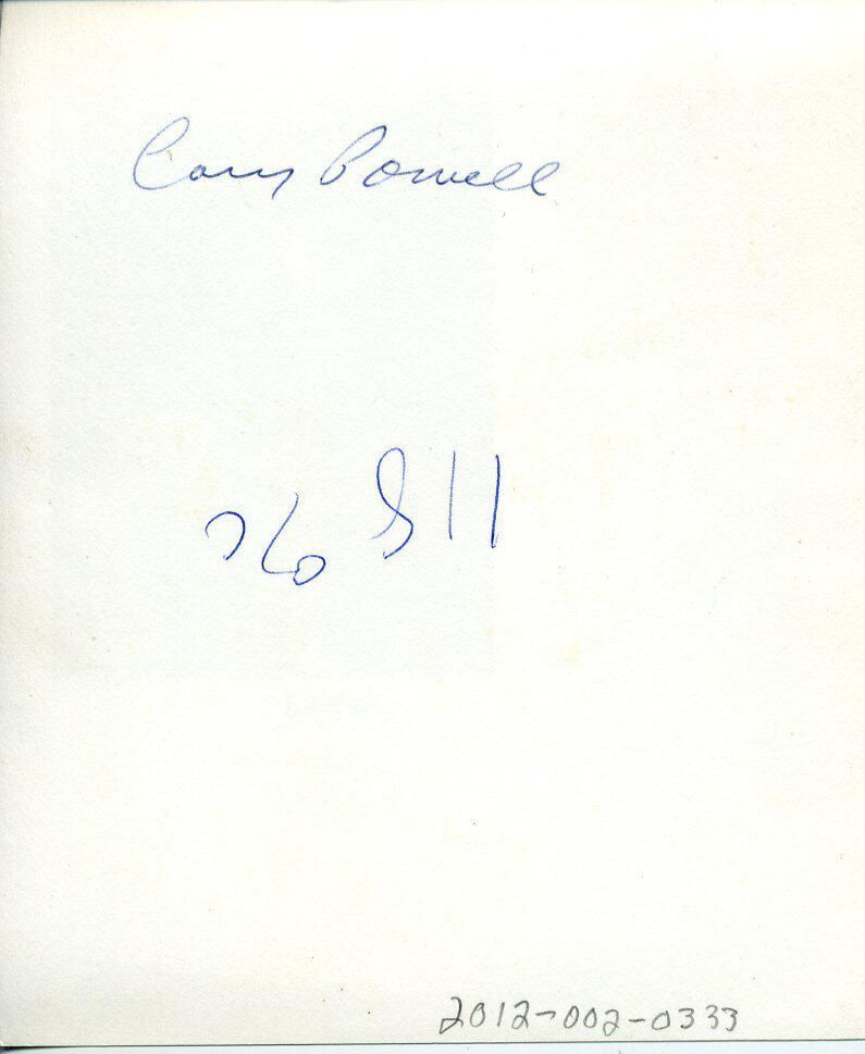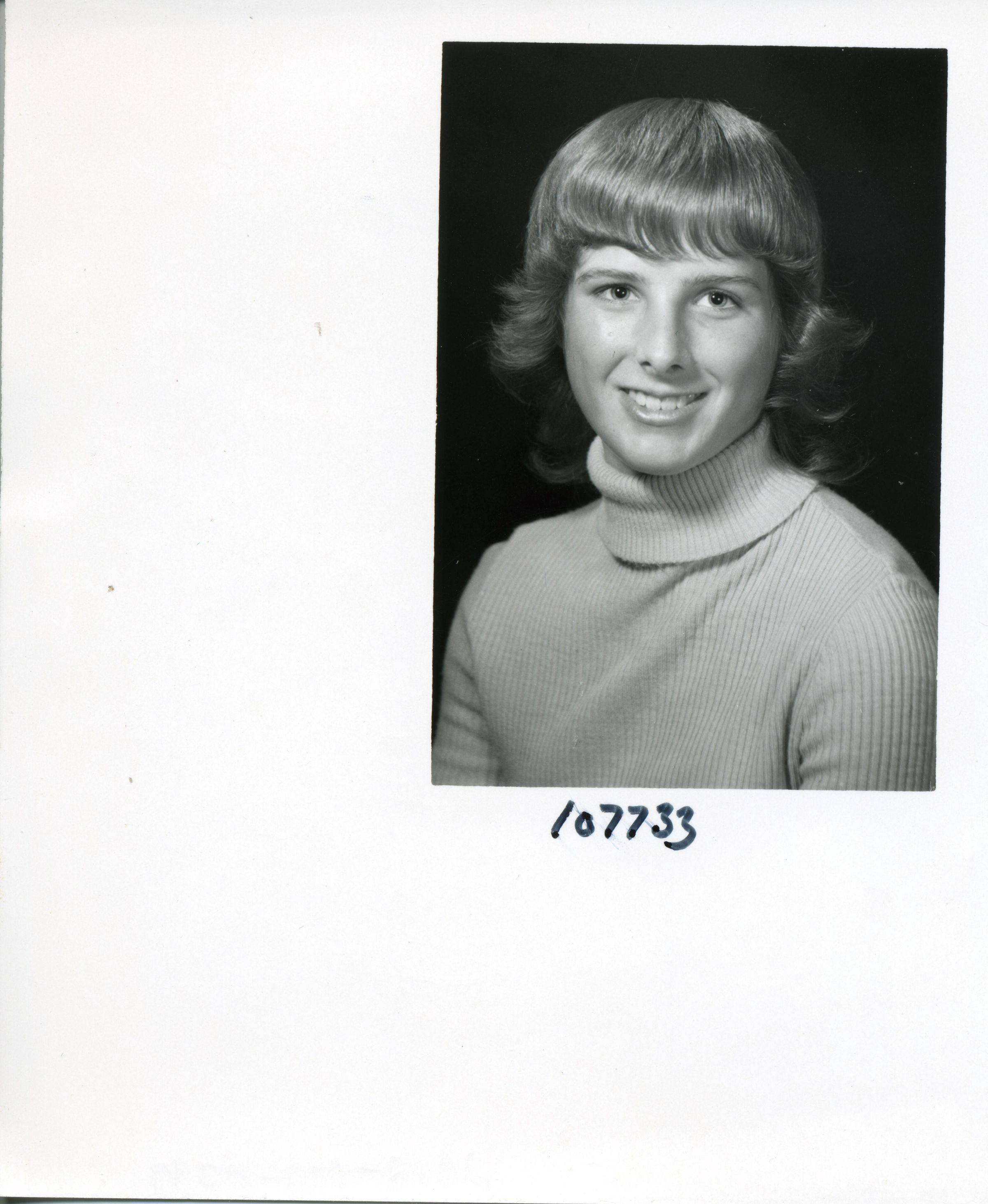 Black and white photo of a smiling Carry Powell. She has light colored shoulder-length hair and is wearing a light colored turtle-neck sweater. The image is in the upper right corner of the print, the rest of which is white. Below the image is "107733". On the back in ink is "Carry Powell" and in different ink "118%".Made/Created