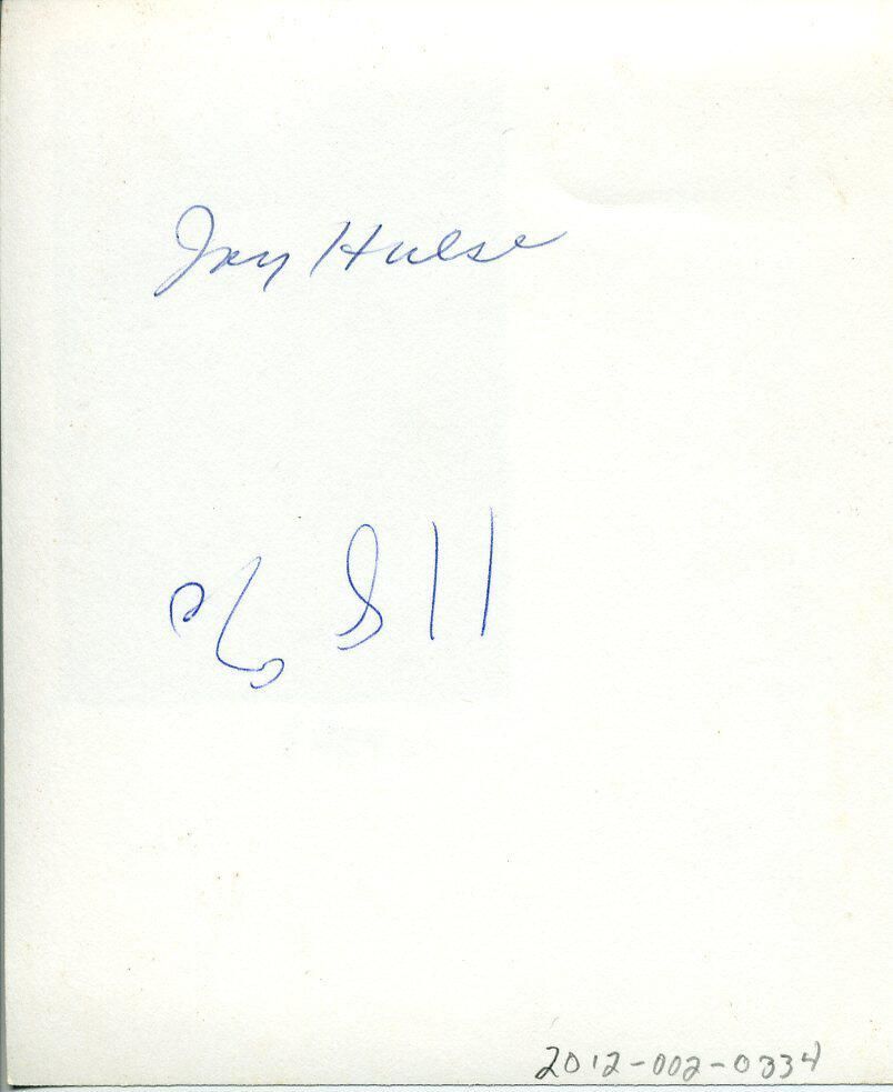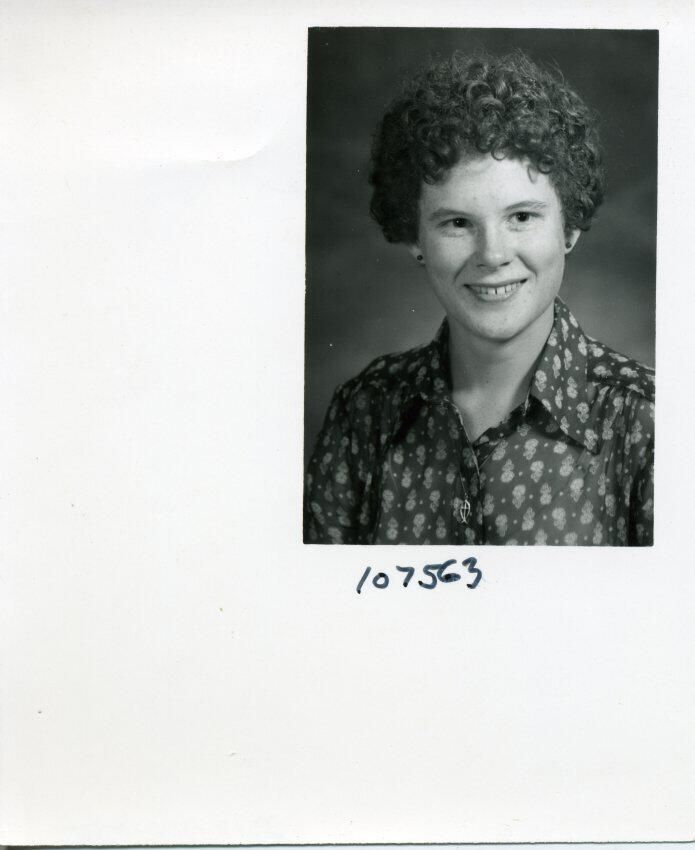 Black and white photo of a smiling Jan Hulse. She has curly hair above her ears. She is wearing a patterned blouse that is open at the collar and buttons are visible. She has on a necklace with a pendent. The image is in the upper right corner of the print, the rest of which is white. Below the image is "107563". On the back in ink is "Jan Hulse" and in different ink is "118%".Made/Created