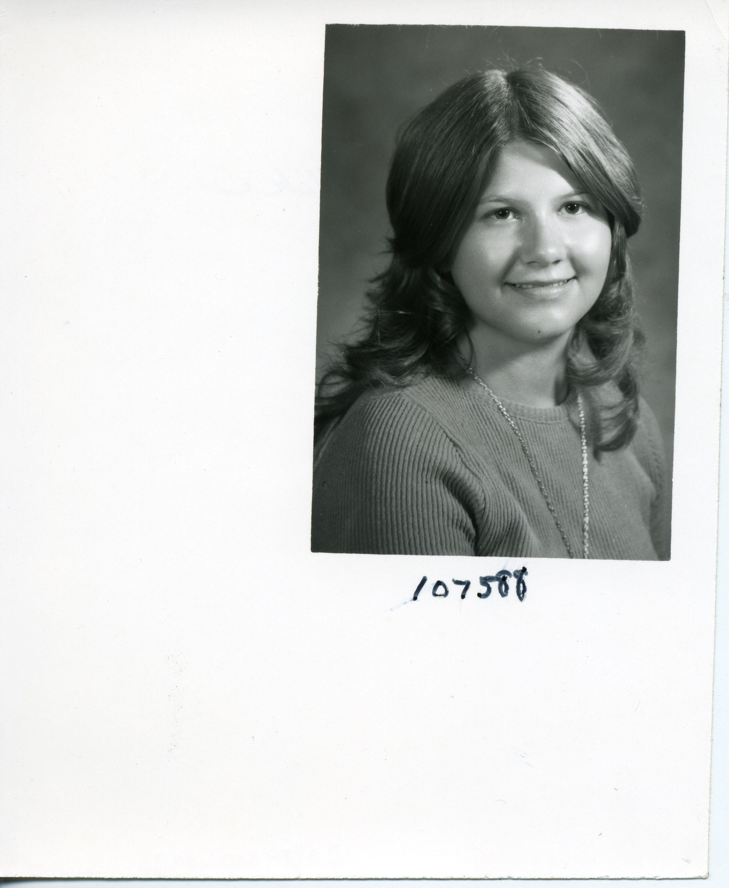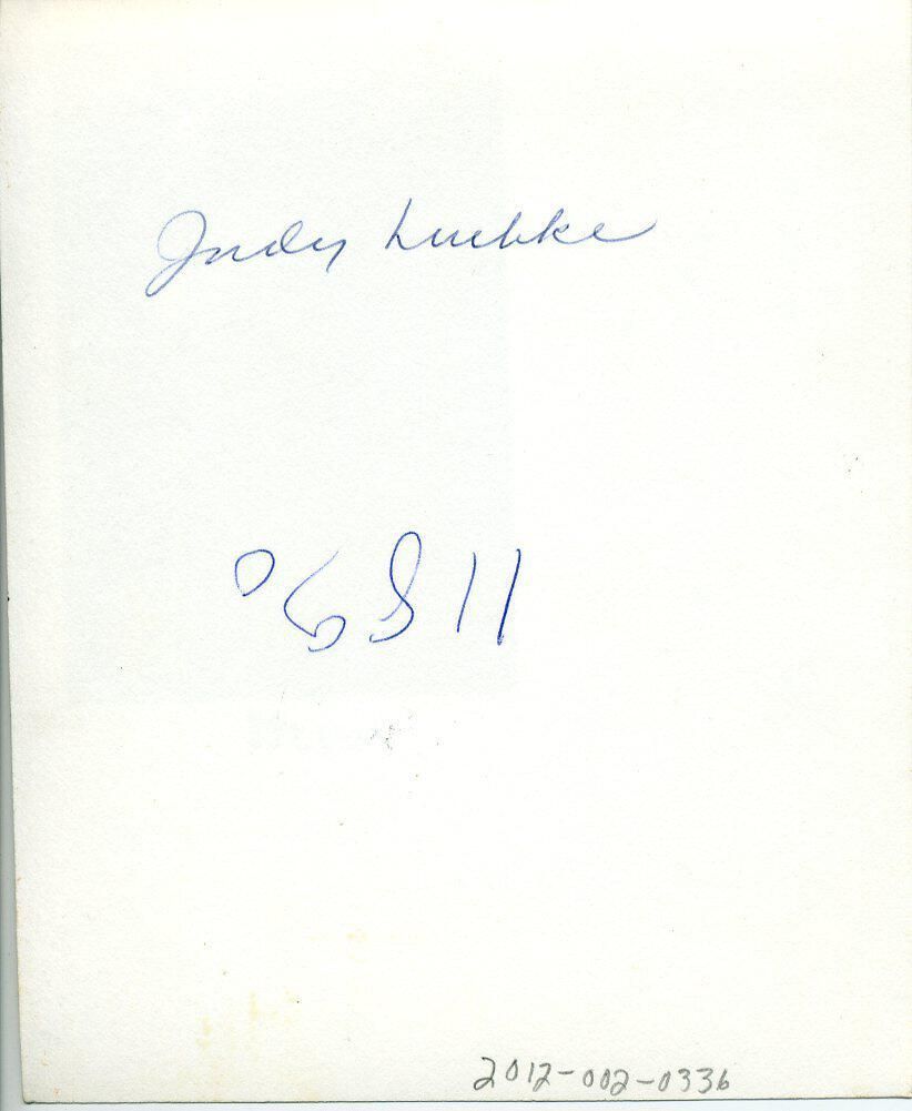 Black and white photo of a smiling Judy Luebke. She has dark hair that falls below her shoulders. She is wearing a dark sweater and has a necklace that extends below the image. The image is in the upper right corner of the print, the rest of which is white. Below the image is "107588". On the back in ink is "Judy Luebke" and in different ink is "118%".Made/Created